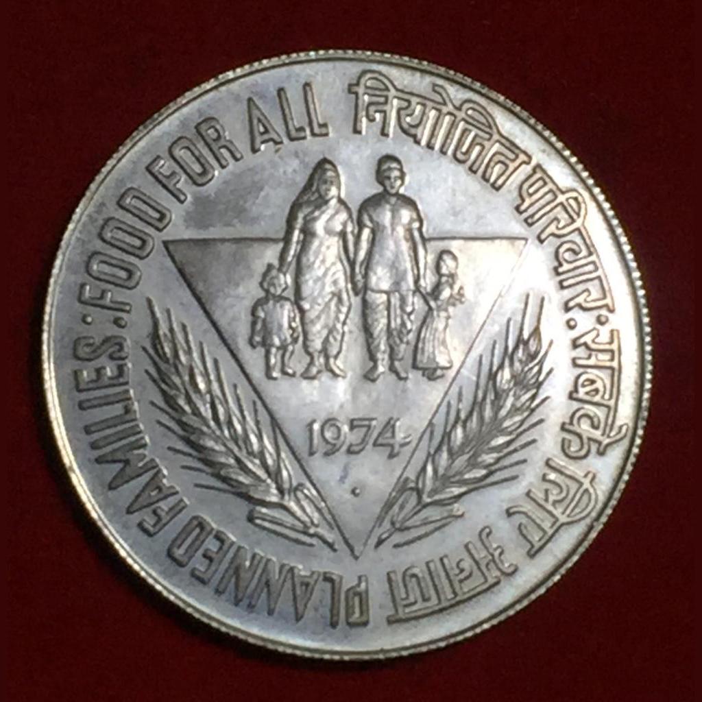 Celebrate the spirit of generosity and unity with this exquisite 1974 50 Rupees silver Food For All Commemorative coin from India. Issued by the Republic, this non-circulating coin carries a denomination of 50 INR and is composed of .500 silver, weighing 34.7g and measuring 44mm in diameter. The coin features a milled technique with a round shape and a thickness of 3mm. With a unique design honoring the theme of planned families by FAO, this collectible piece holds significant historical value, symbolizing a commitment to social welfare. Its rarity, coupled with its intricate detailing and impeccable condition, makes it a prized possession for numismatists and collectors alike. This coin comes with a medal alignment and is numbered N#27598, adding to its exclusivity.