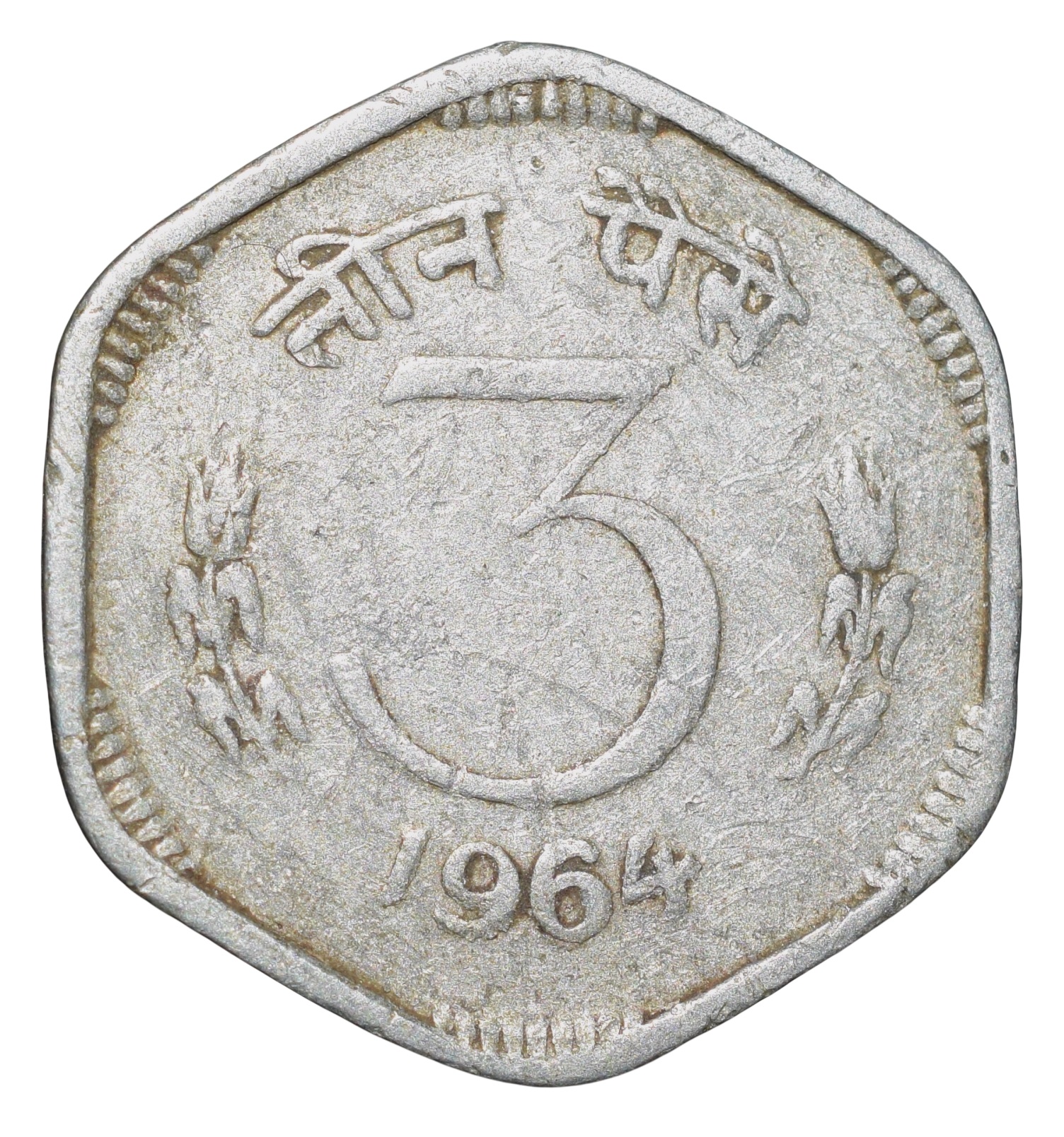 Aluminium 3 Paise of Republic India (AD 1964) of Calcutta Mint
