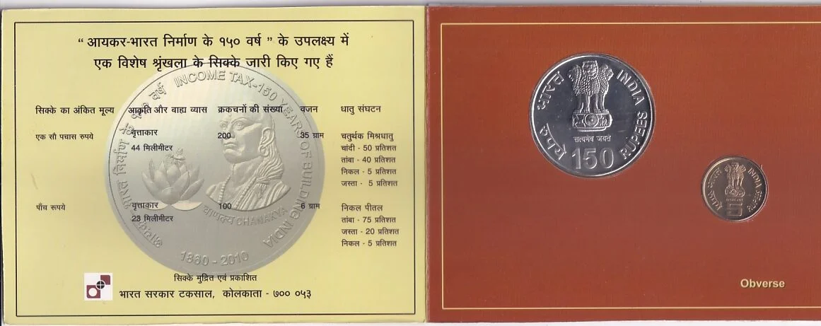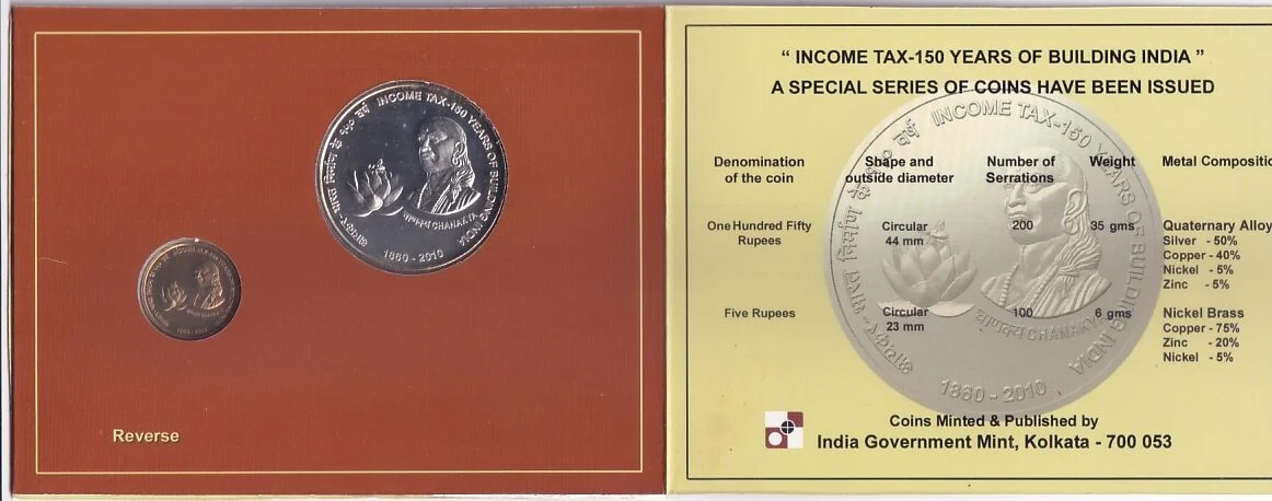 Income Tax 150 Years 5 Rupees and 150 Rupees Two Coins UNC BLISTER