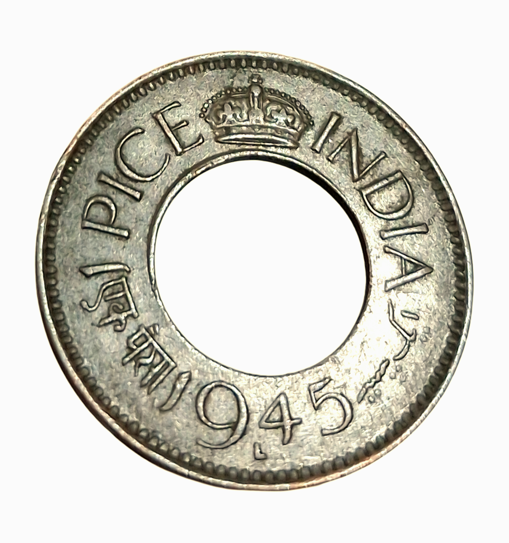 BRITISH INDIA 1 PICE Copper “HOLE PICE” Year 1945 “L” LAHORE Mint **SCARE** Collectable Grade.