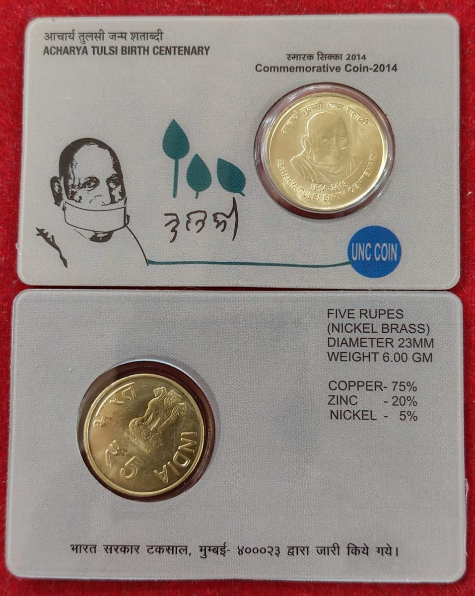 Rs.5 ACHARYA TULSI 2014 Commemorative Coin Card Special Edition