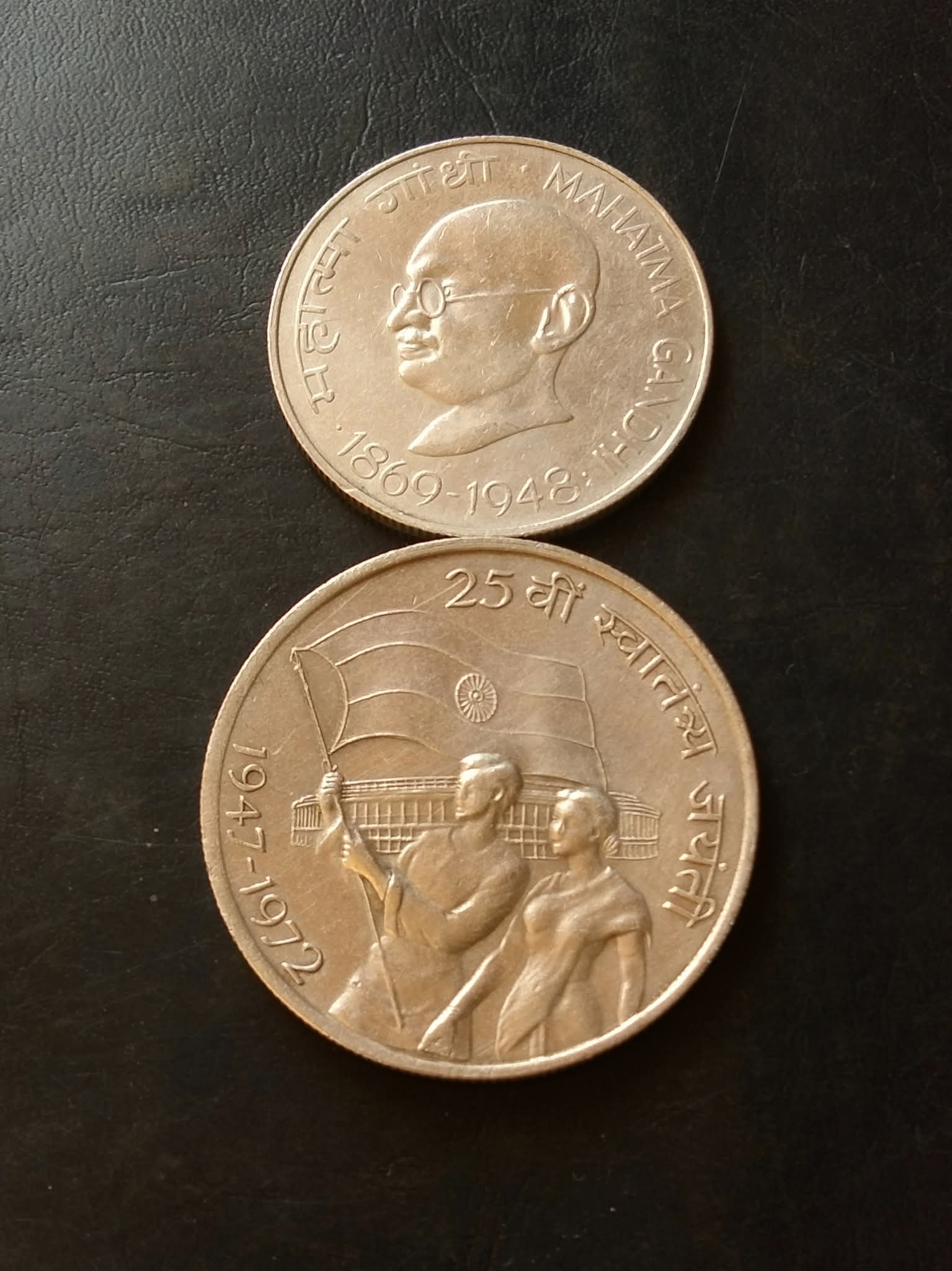 SILVER 10RS 1972 25TH ANNIVERSARY OF INDEPENDENCE WEIGHT 22 GM & M.GANDHI 100TH BIRTHDAY EXCELLENT CONDITION. Same and similar piece available