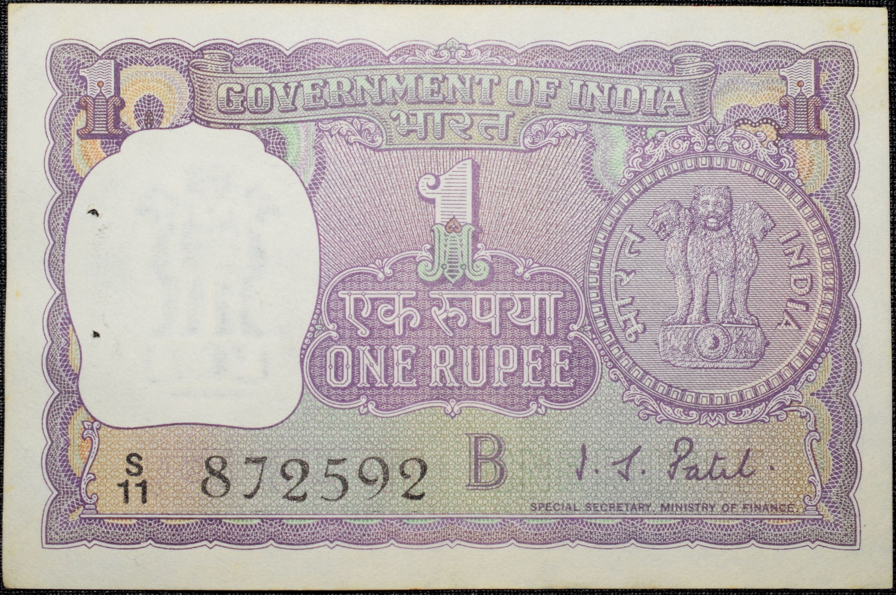 1 Rupee of Republic India (AD 1968) I.G. Patel – Violet color. Smaller watermark window and numbers to the left. Large ornamental 1 in the centre