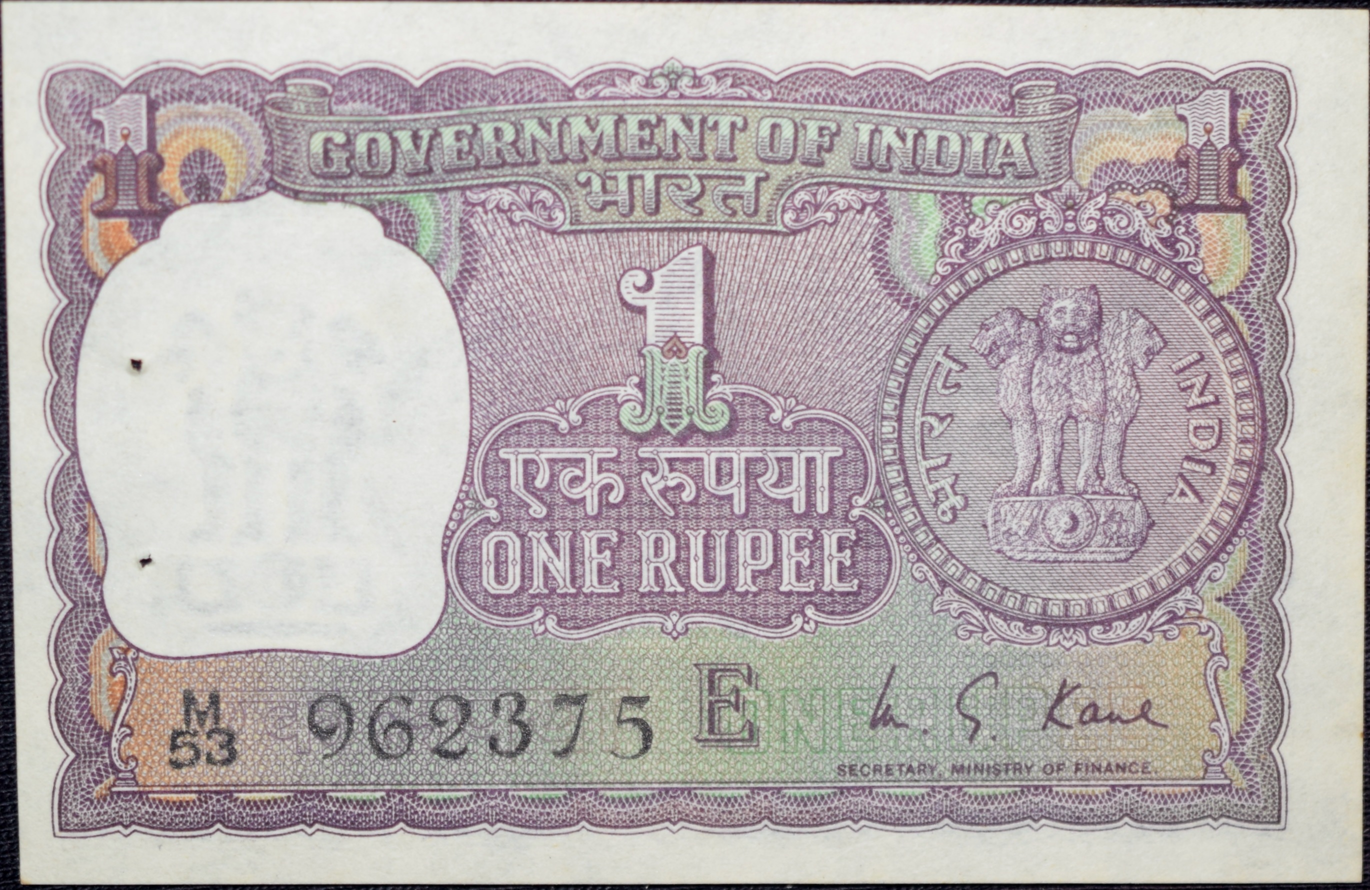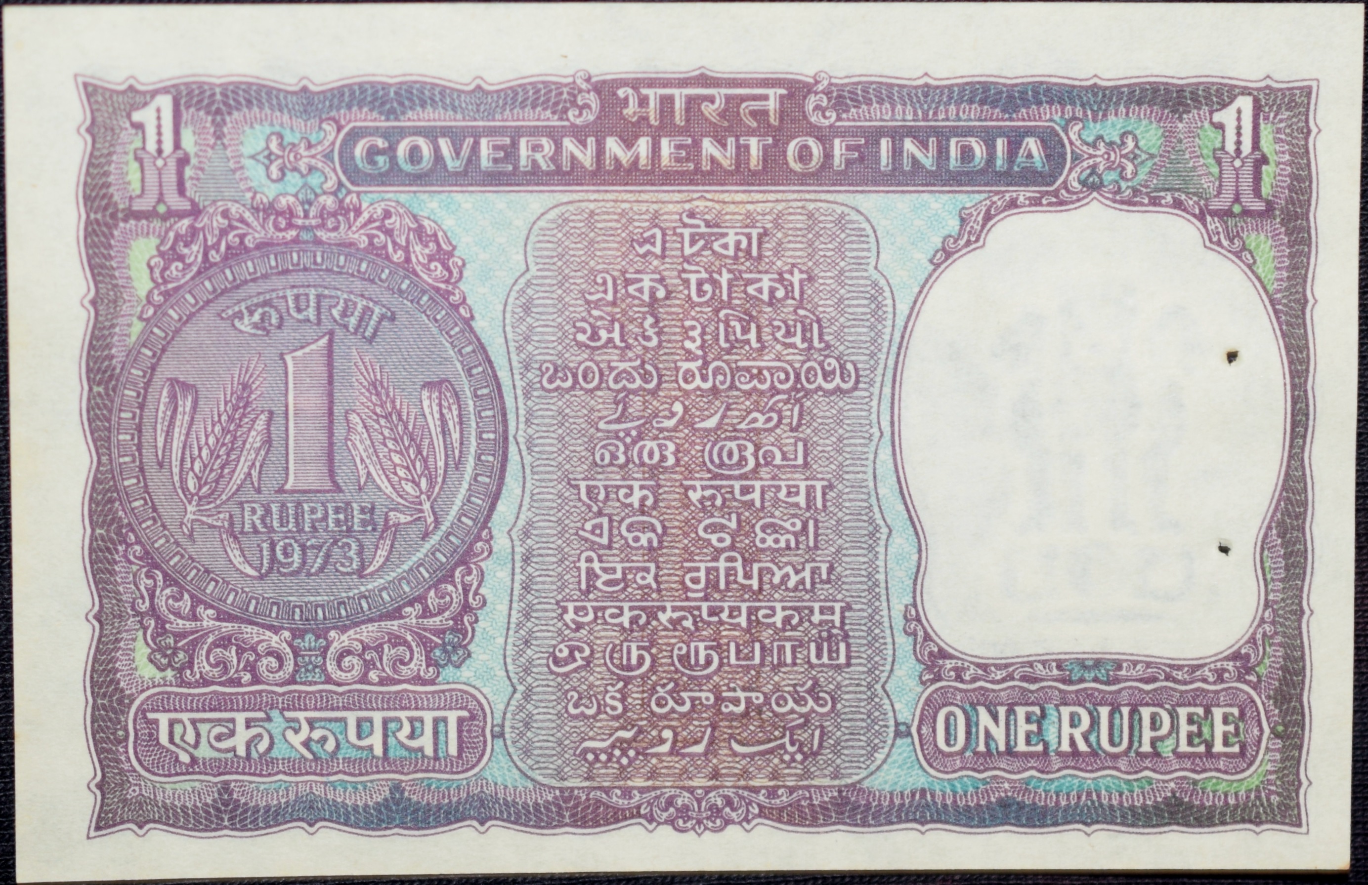 1 Rupee of Republic India (AD 1973) M.G. Kaul – Violet color. Smaller watermark window and numbers to the left. Large ornamental 1 in the centre