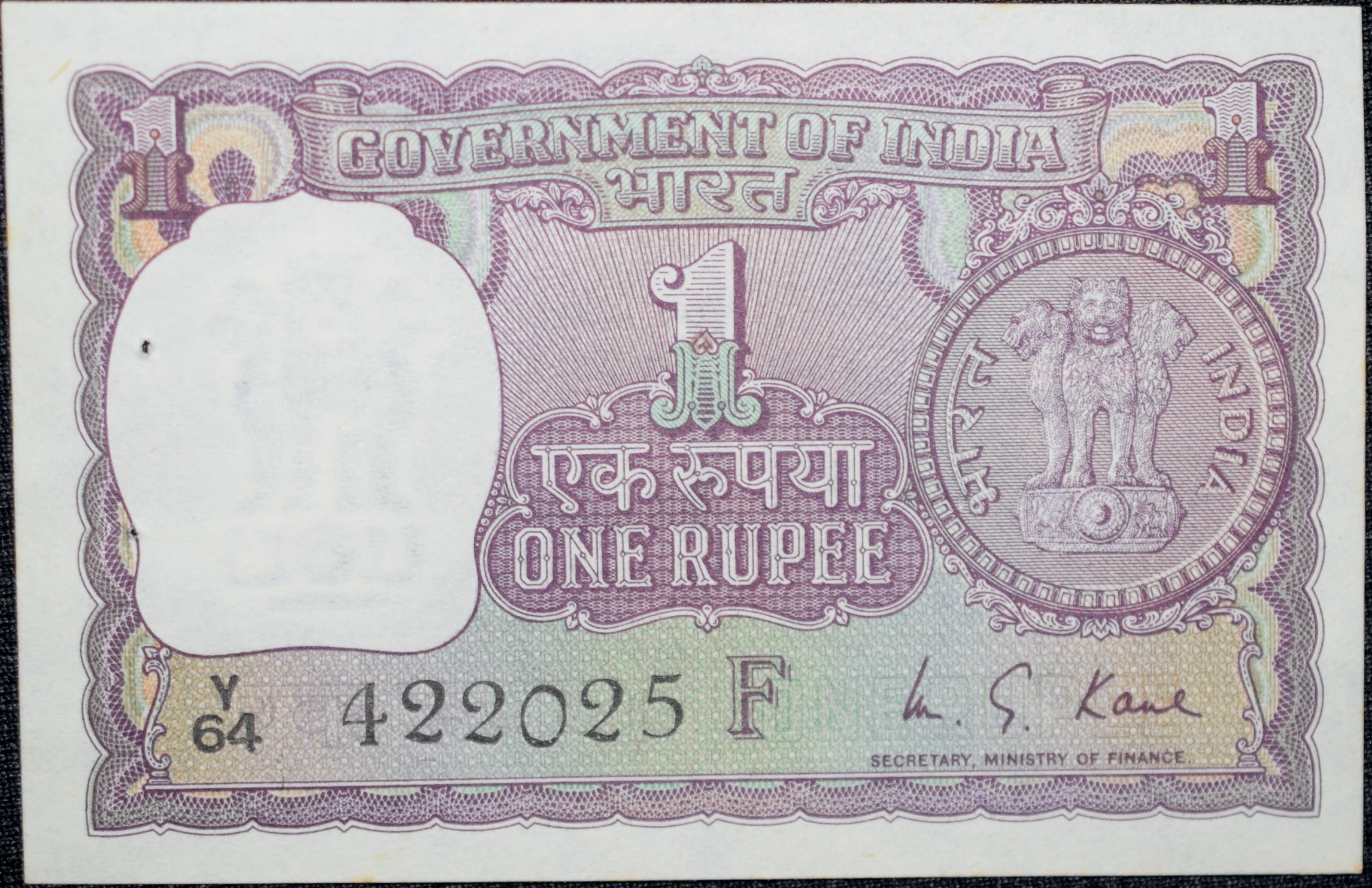 1 Rupee of Republic India (AD 1974) M.G. Kaul – Violet color. Smaller watermark window and numbers to the left. Large ornamental 1 in the centre