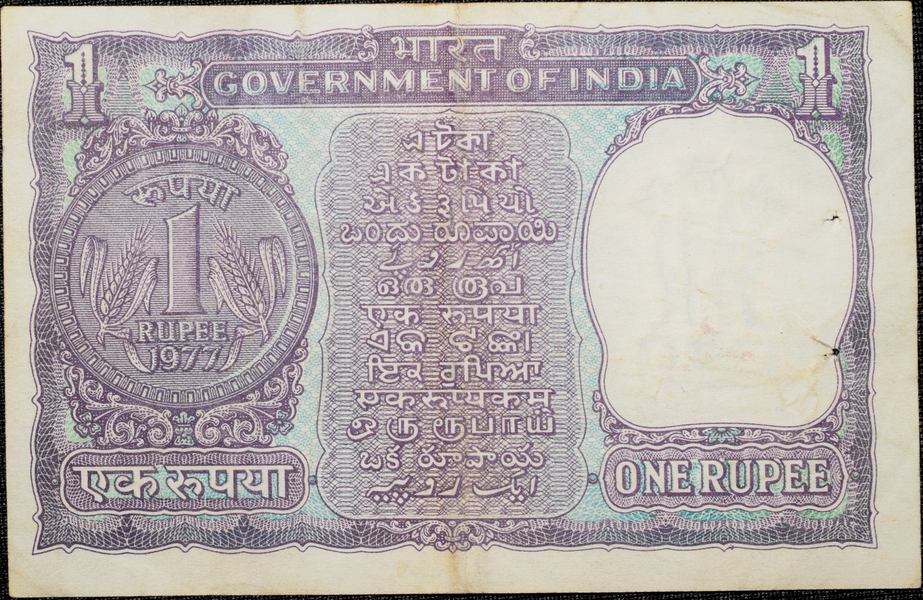 1 Rupee of Republic India (AD 1977) Manmohan Singh – Violet color. Smaller watermark window and numbers to the left. Large ornamental 1 in the centre