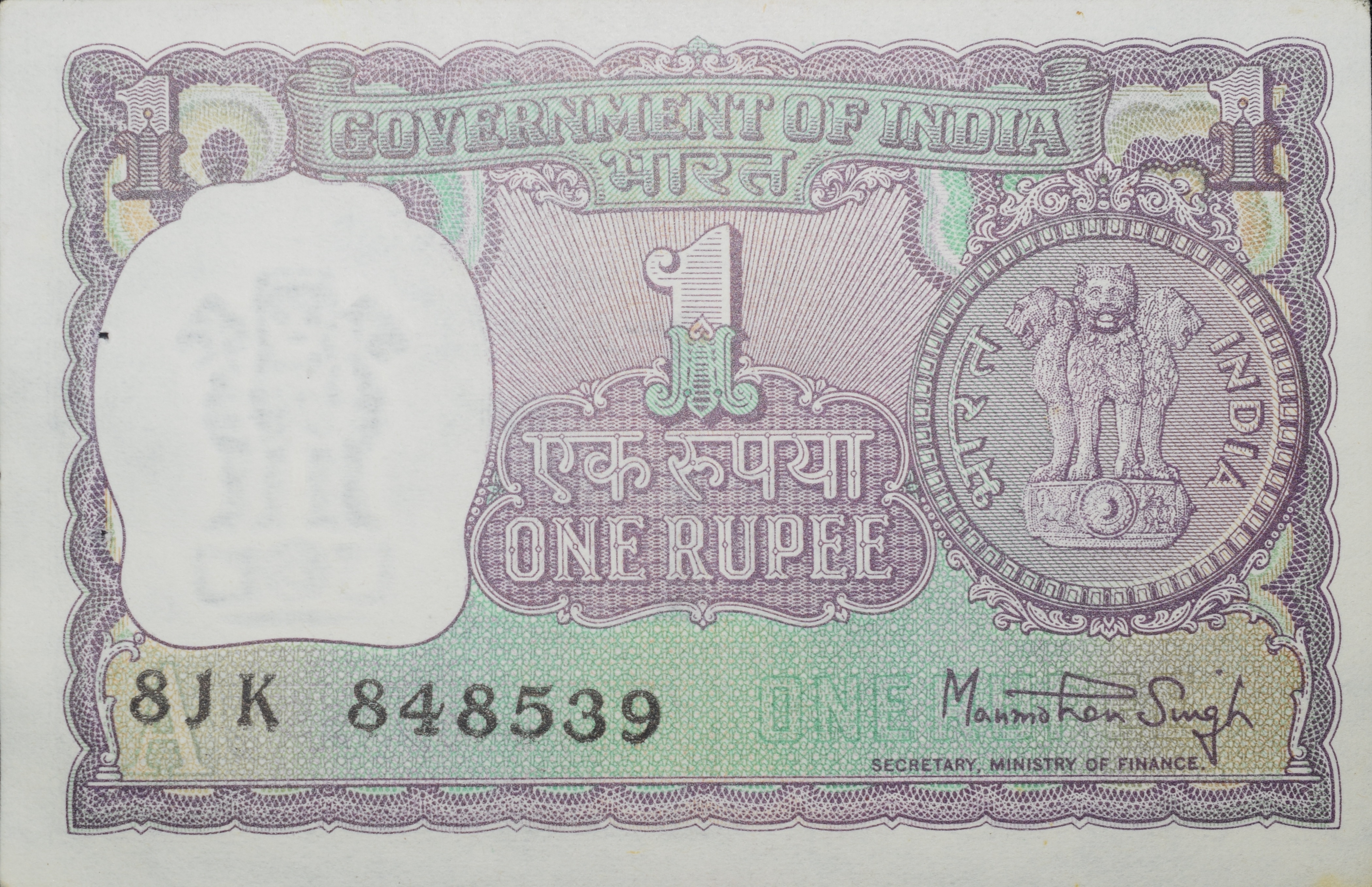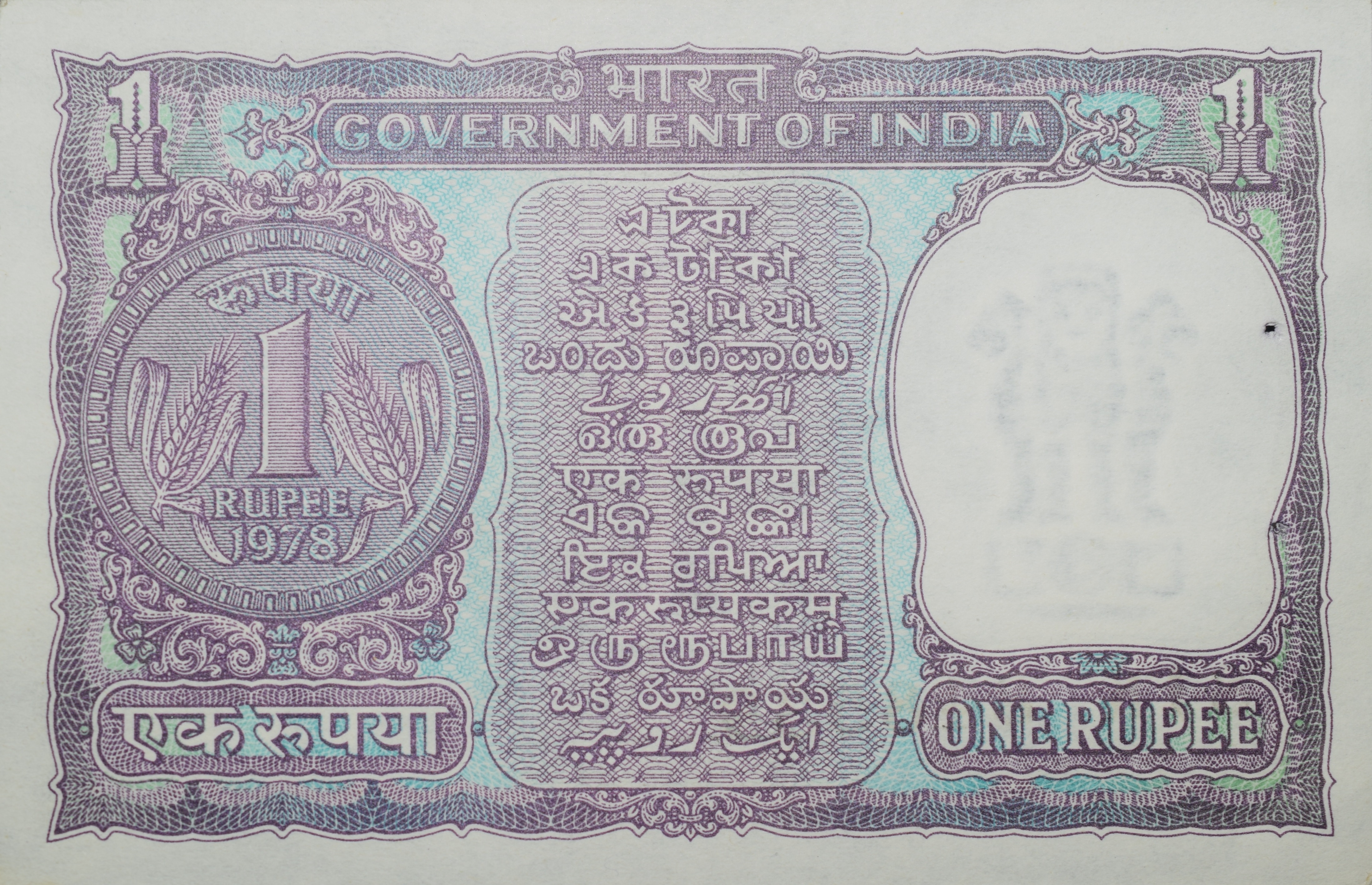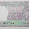 1 Rupee of Republic India (AD 1978) Mamohan Singh Signature with Violet color. Smaller watermark window and numbers to the left. Large ornamental 1 in the centre