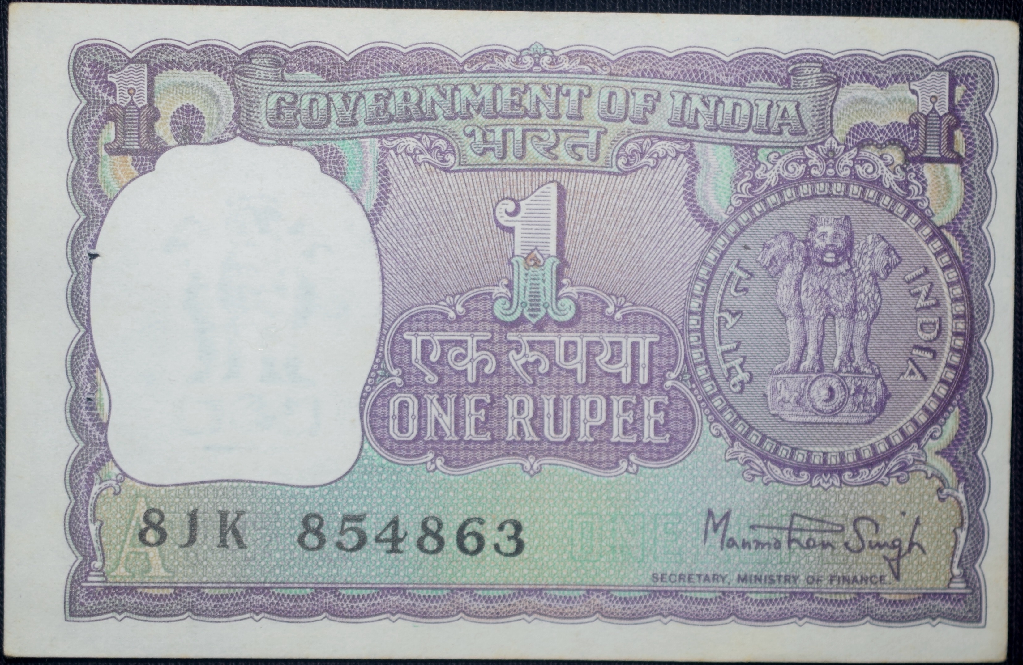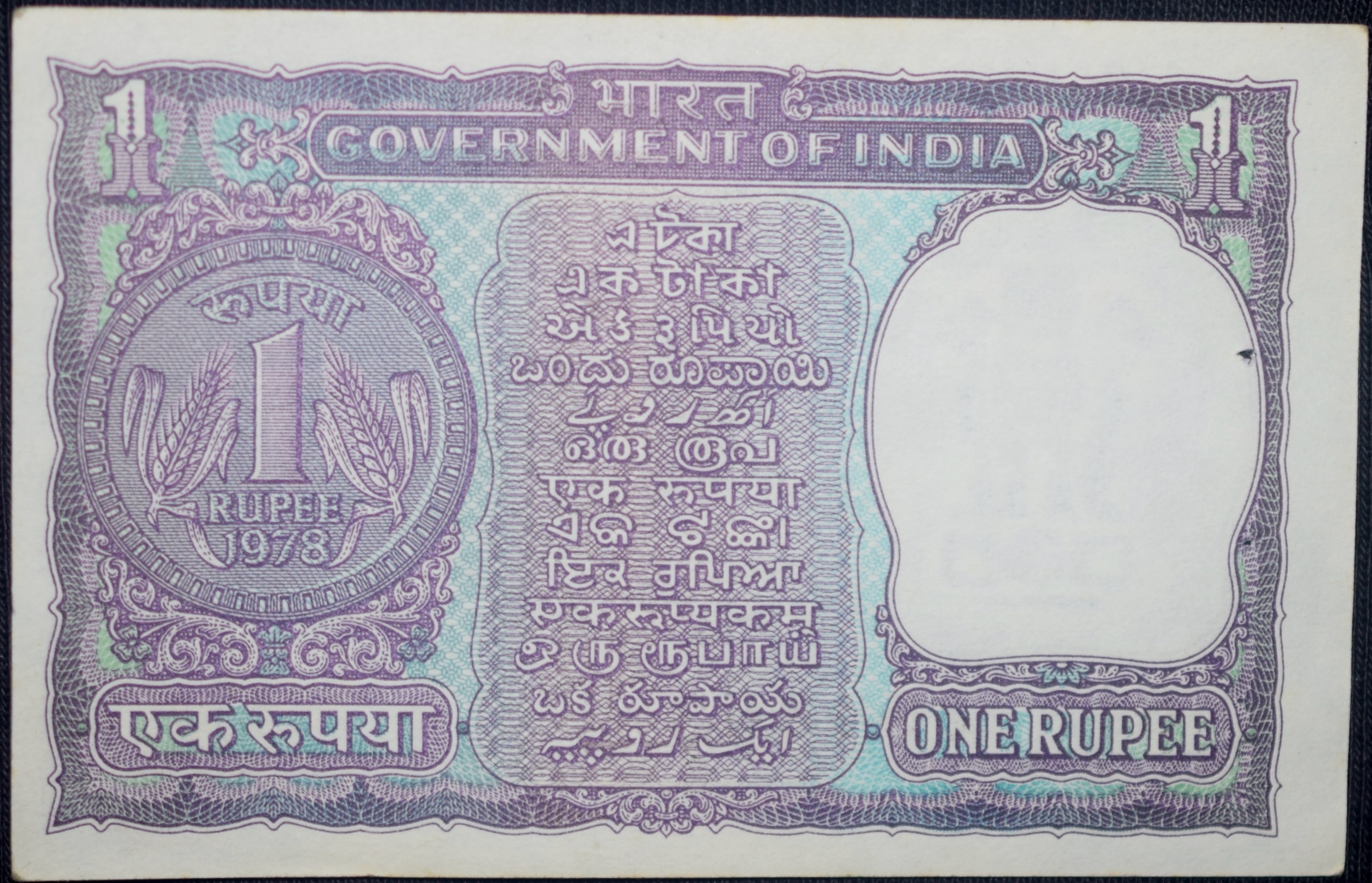 1 Rupee of Republic India (AD 1978) Manmohan Singh Signature with Violet color. Smaller watermark window and numbers to the left. Large ornamental 1 in the centre