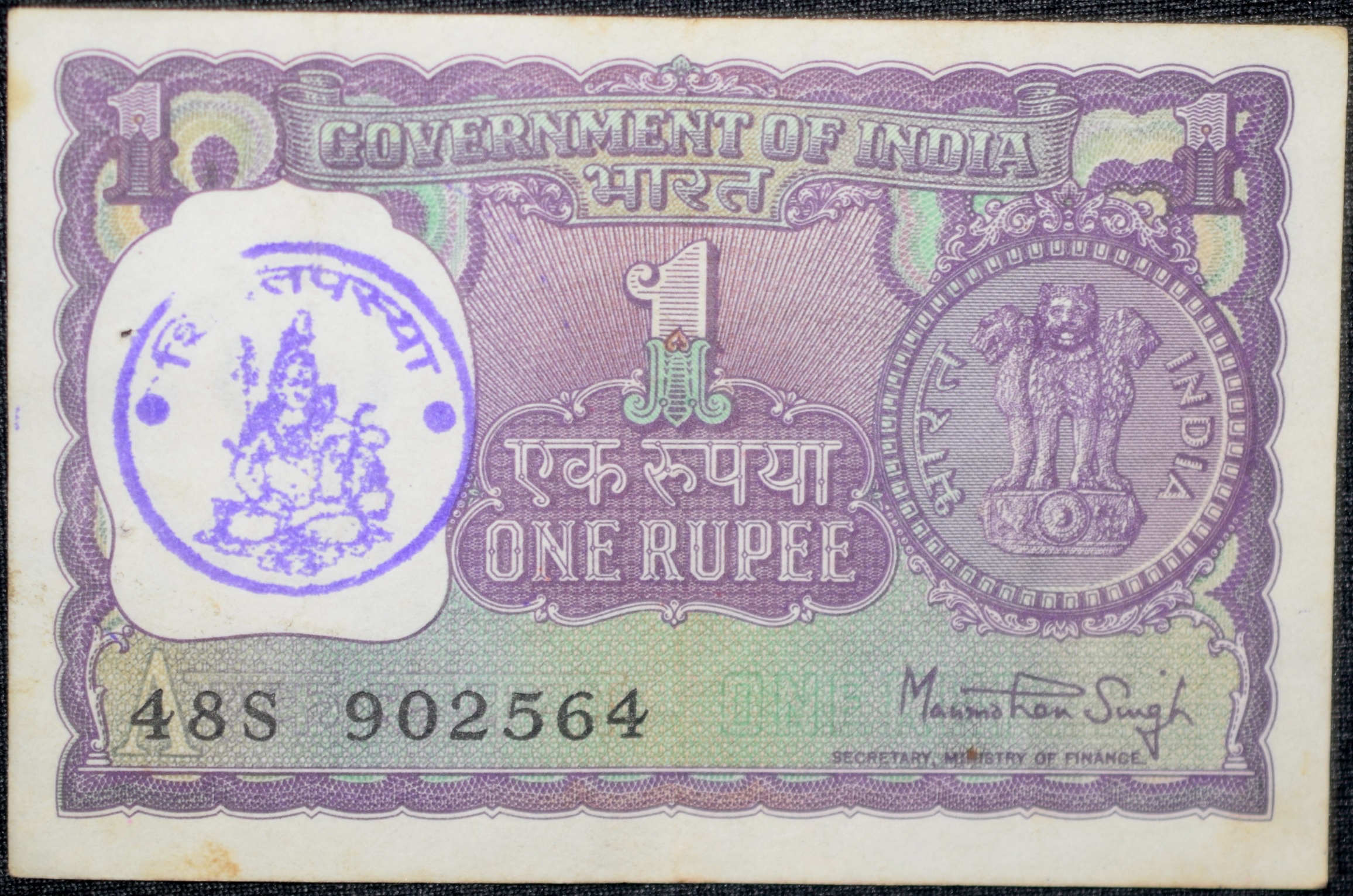 1 Rupee of Republic India (AD 1980) Manmohan Singh – Violet color. Smaller watermark window and numbers to the left. Large ornamental 1 in the centre