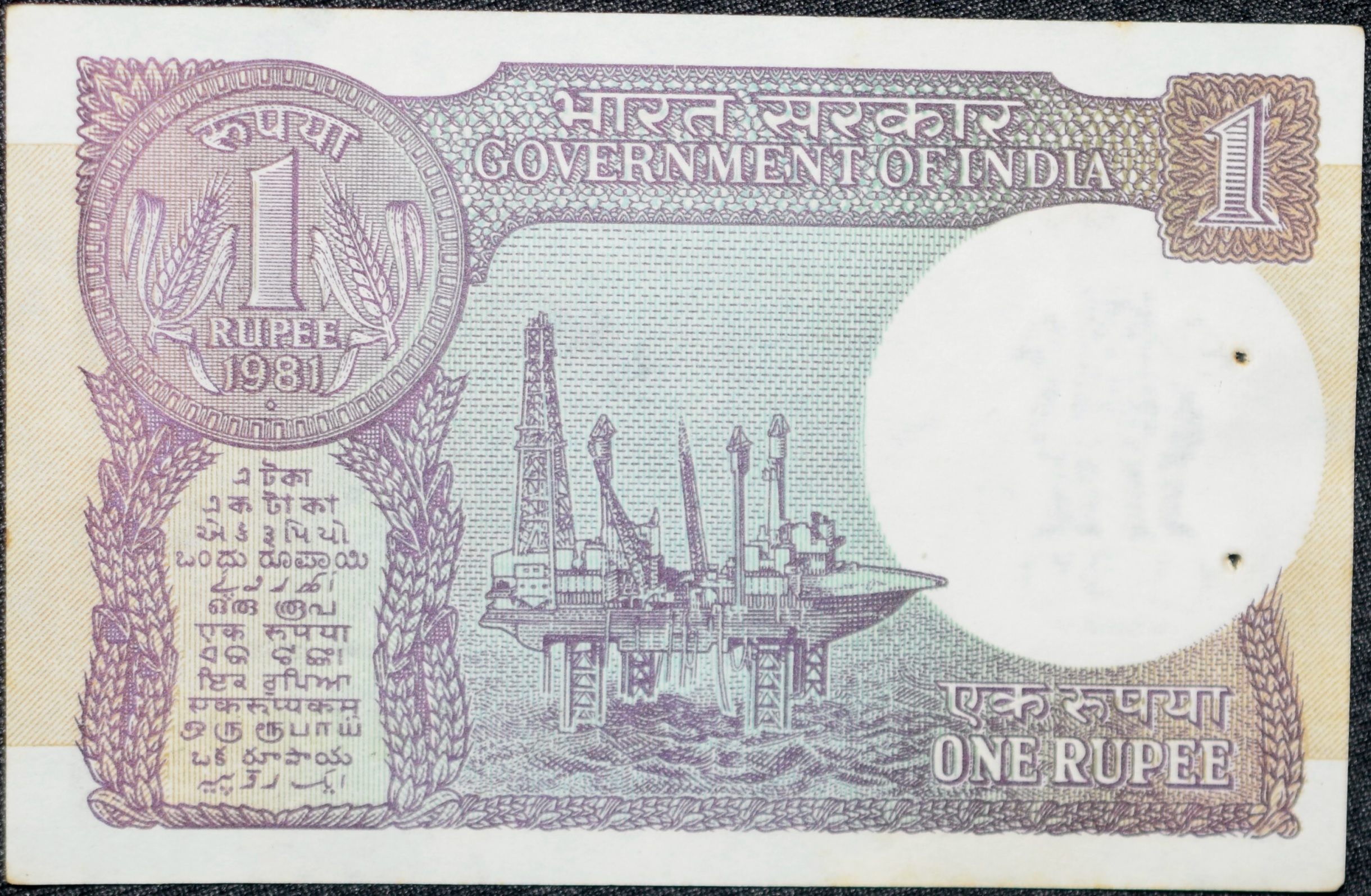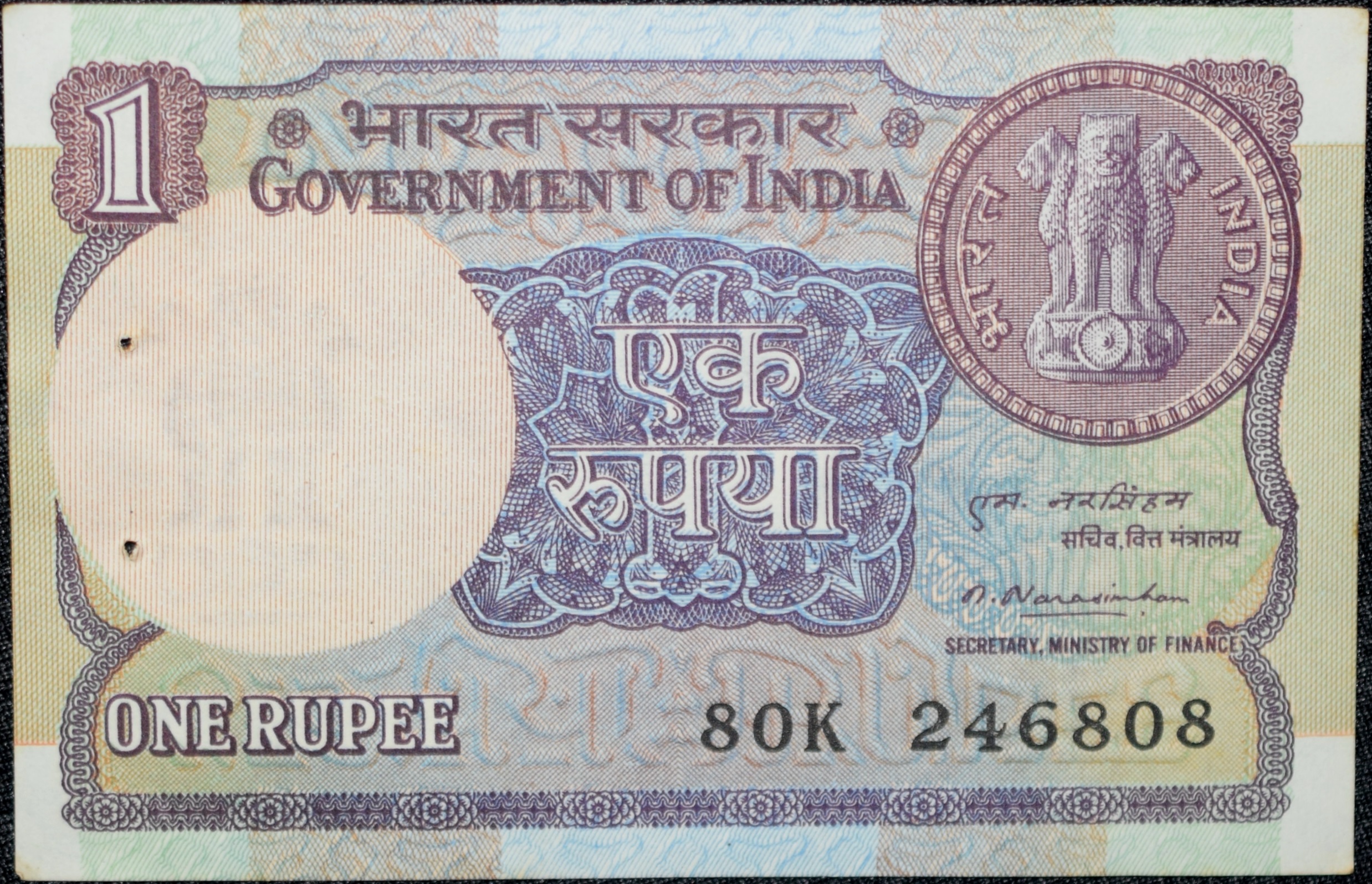 1 Rupee of Republic India (AD 1981) M. Narasimham Signature – Violet color. Smaller watermark window and numbers to the left. Large ornamental 1 in the centre Rare