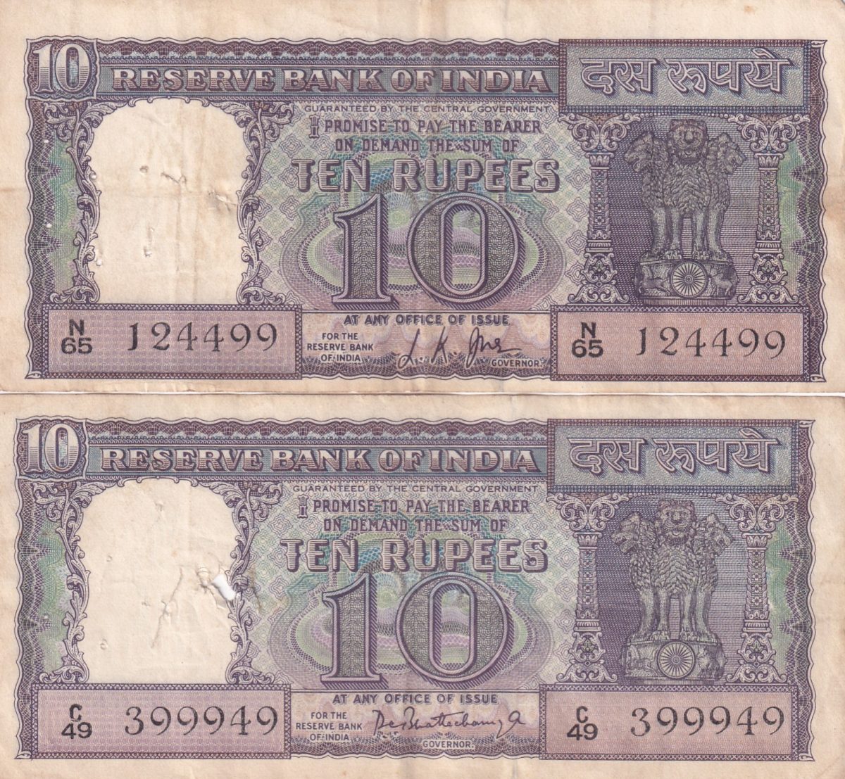10 RUPEES DIAMOND ISSUE 2 DIFFERENT GOVERNOR L.K. JHA AND P.C.BHATTACHARYA RARE(2 NOTE SET)