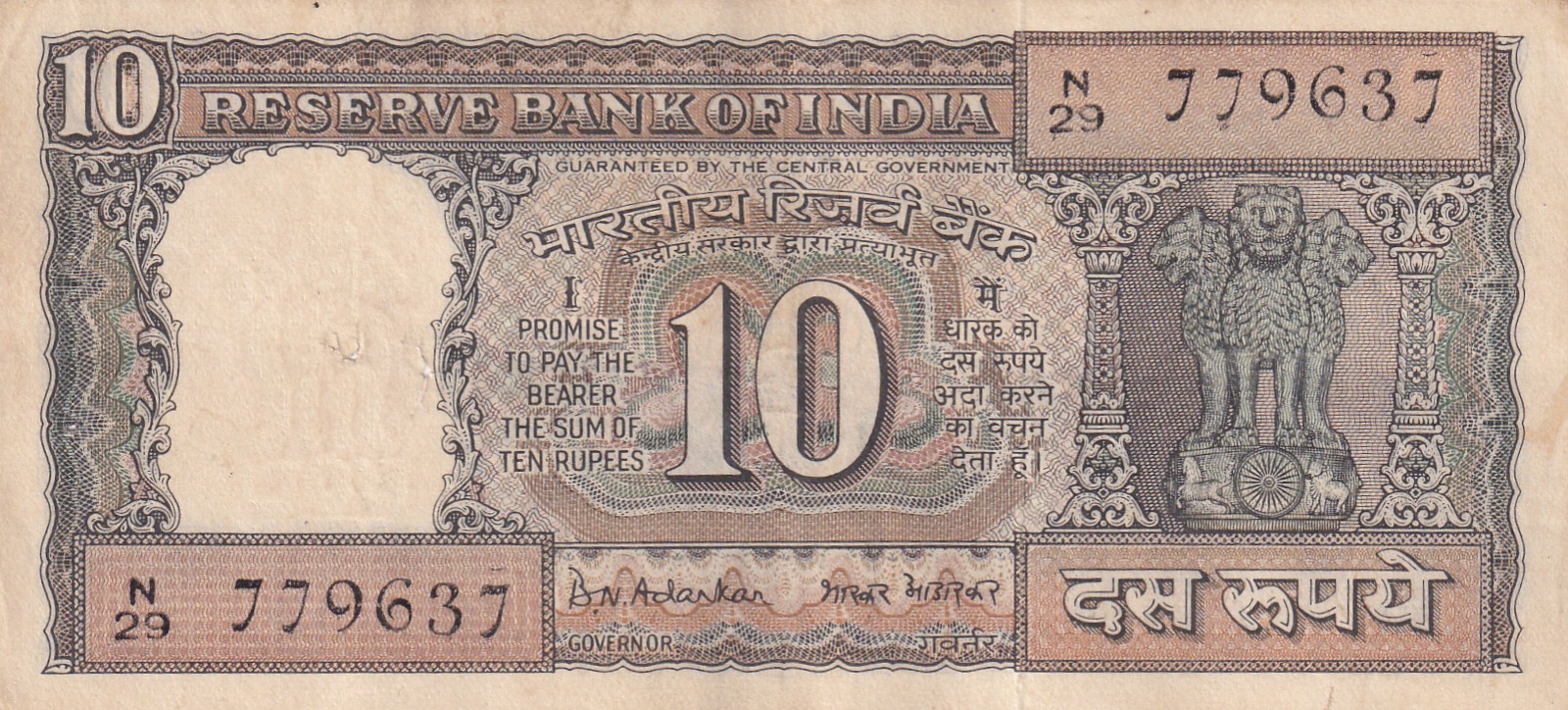 10 RUPEES GANDHI GOVERNOR B.N ADARKAR RARE NOTE
