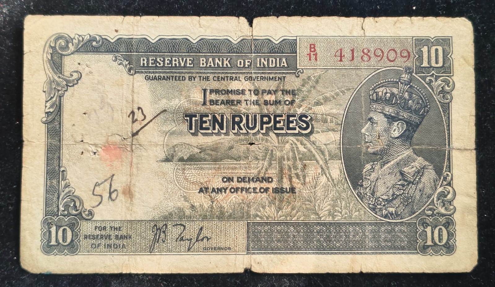 10 RUPEES GEORGE VI GOVERNOR J.B.TAYLOR BUYER WILL RECEIVE SAME CONDITION NOTE AS PER IMAGE