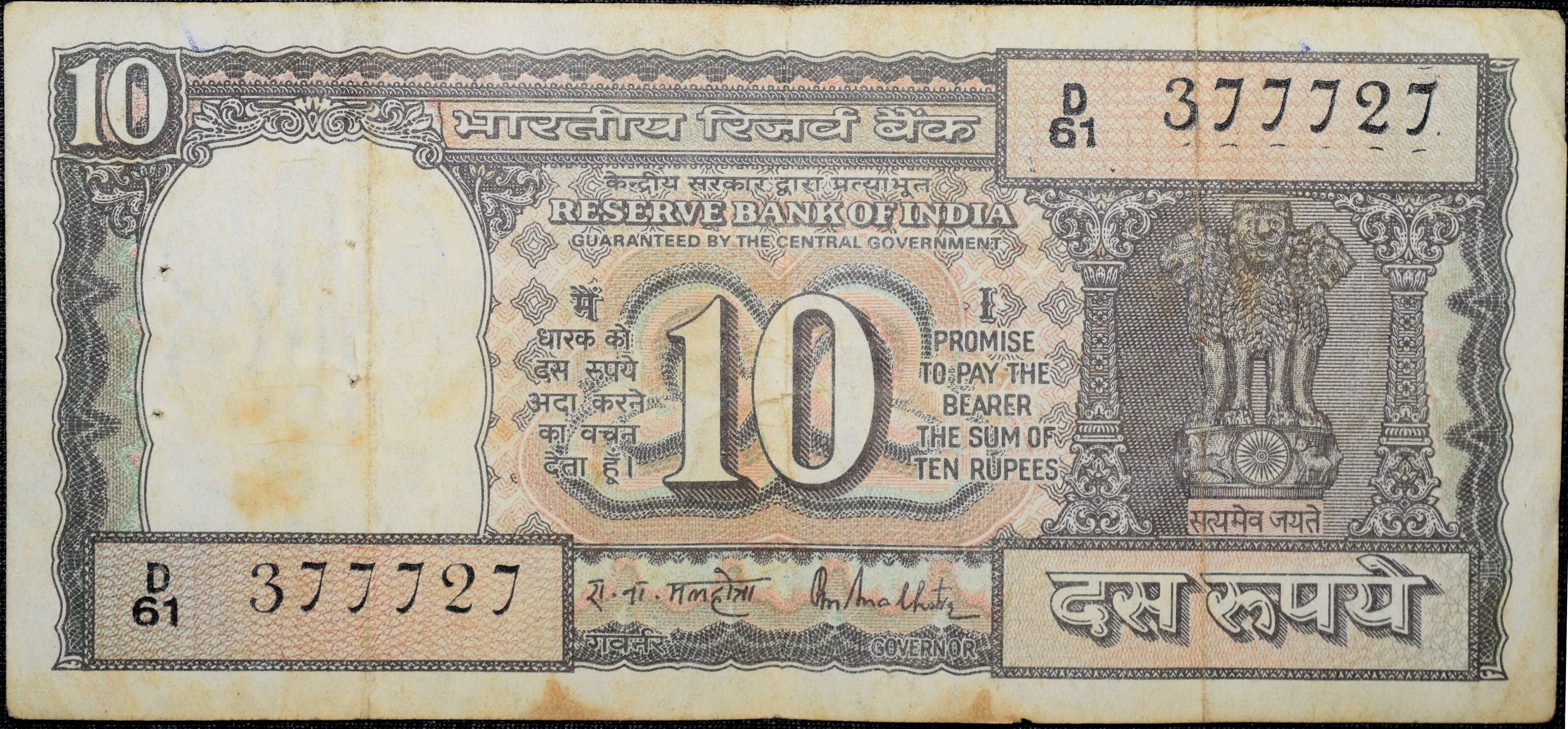 10 Rupees of Republic India (AD 1985-1990) R.N.Malhotra Signature Black note with Boat