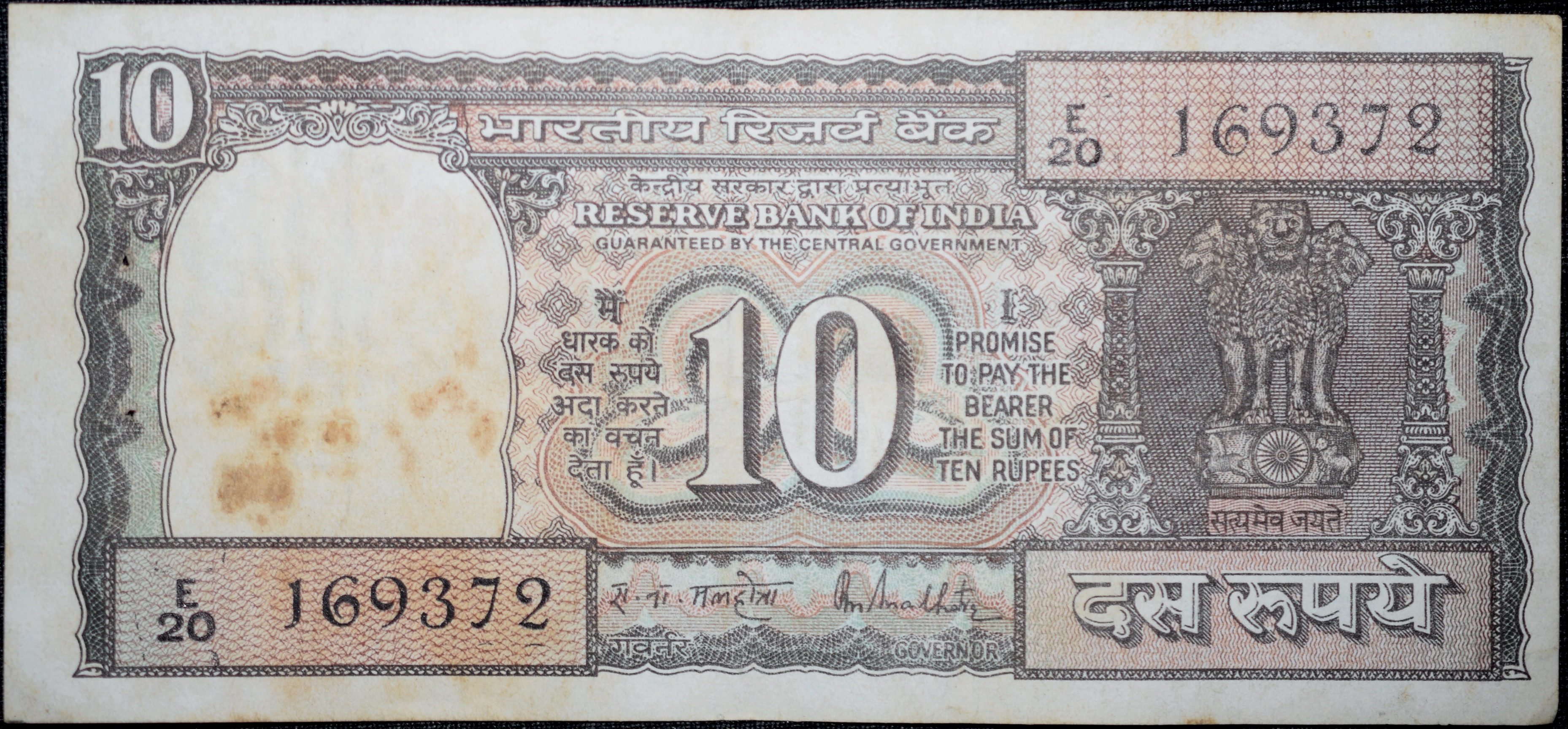 10 Rupees of Republic India (AD 1985-1990) R.N.Malhotra Signature Black note with Boat