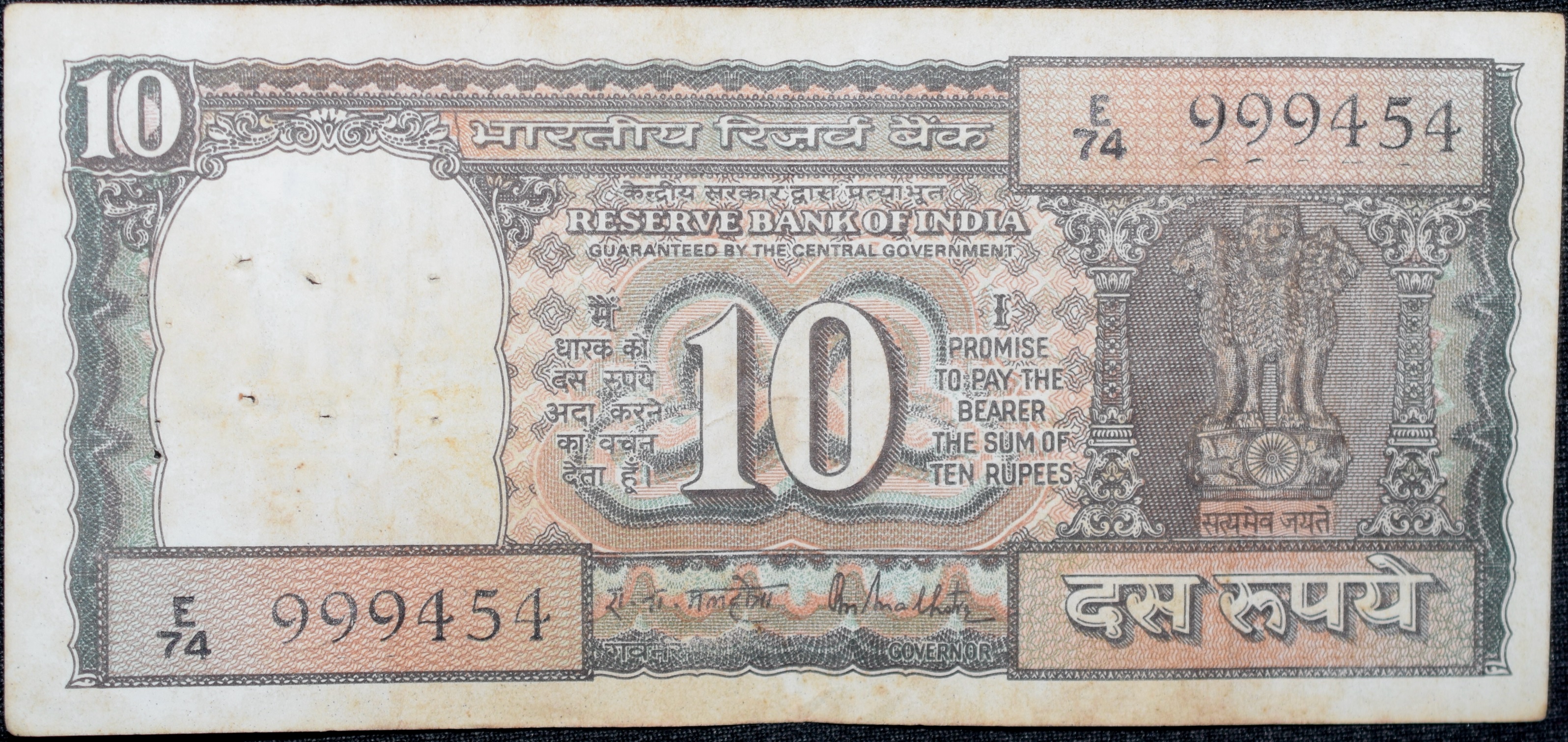 10 Rupees of Republic India (AD 1985-1990) R.N.Malhotra Signature Black note with Boat Semi Fancy ‘999’