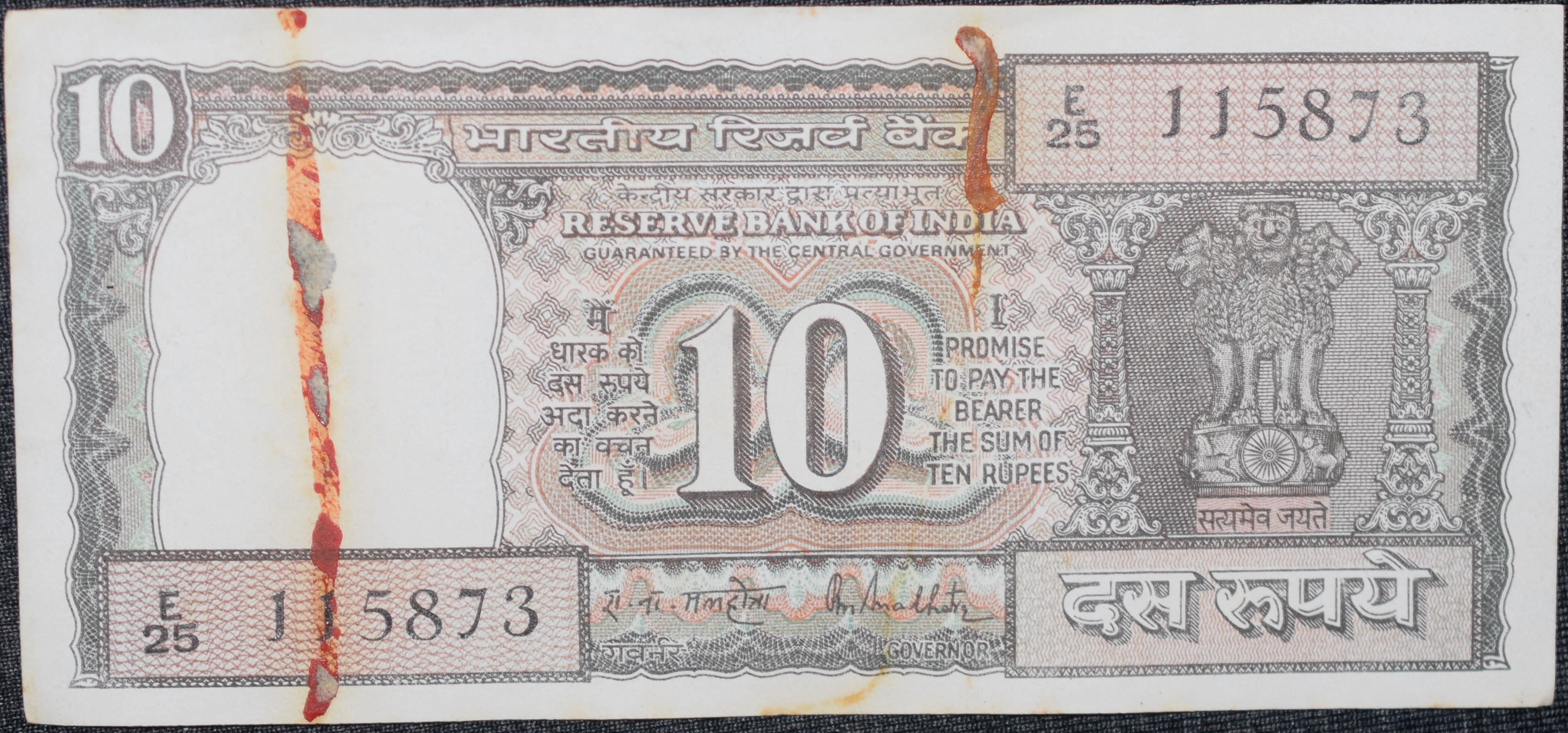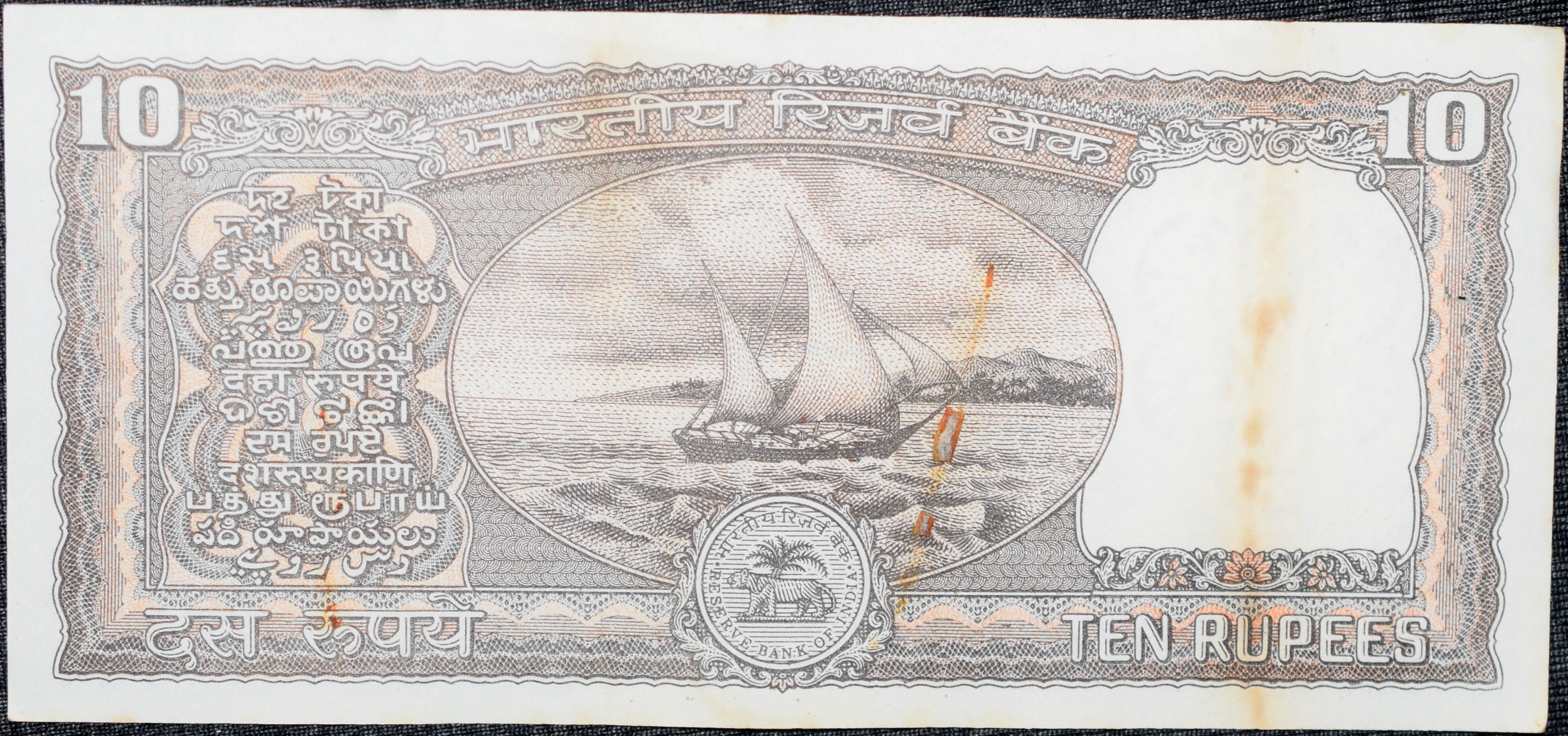 Republic India, (AD 1985-1990), 10 Rupees, R.N. Malhotra Signature, Black Note with Boat on Reverse, About Very Fine as per Image.