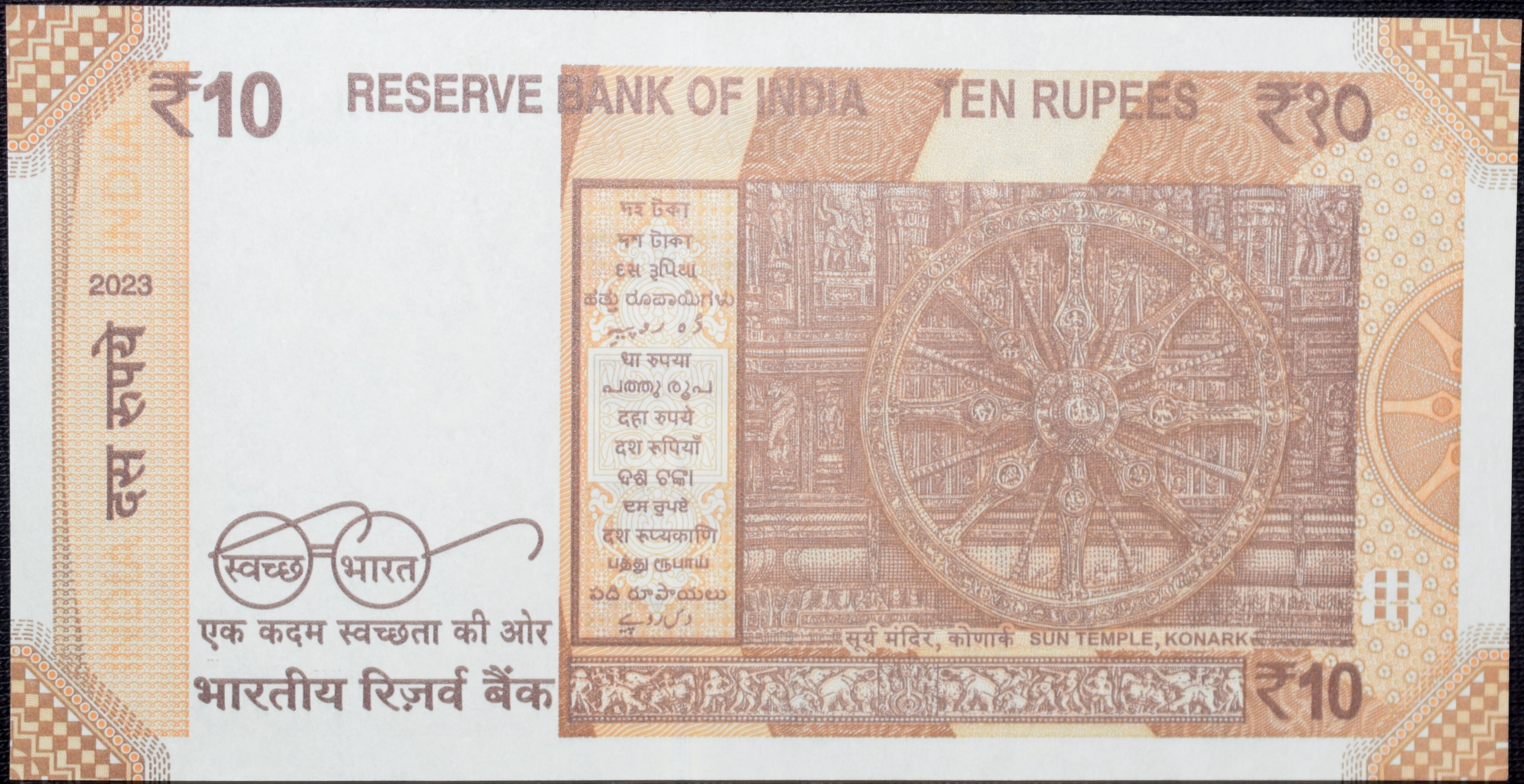 10 Rupees of Republic India (AD 2023) with Chariot Wheel at Konark Sun Temple Fancy No. ‘786’