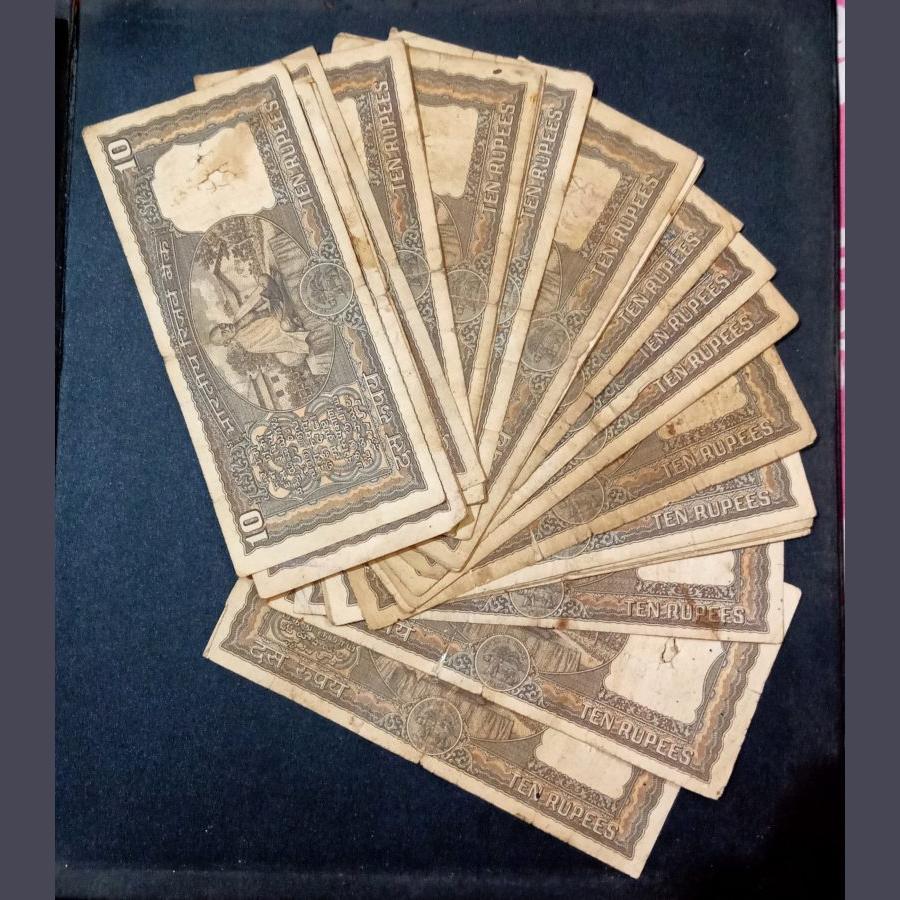 10 Rupees Old COMMEMORATIVE Issue Both Signatures B.R ADARKAR and L.K JHA “Gandhi Ji Sitting Back Reading Bhaagwat Gita” Mixed Lot 25 Notes VERY RARE Used Conditions.