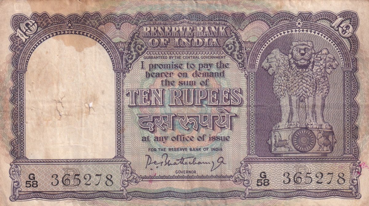 10 RUPEES OLD ISSUE BIG SIZE FAFDA GOVERNOR P.C.BHATTACHARYA