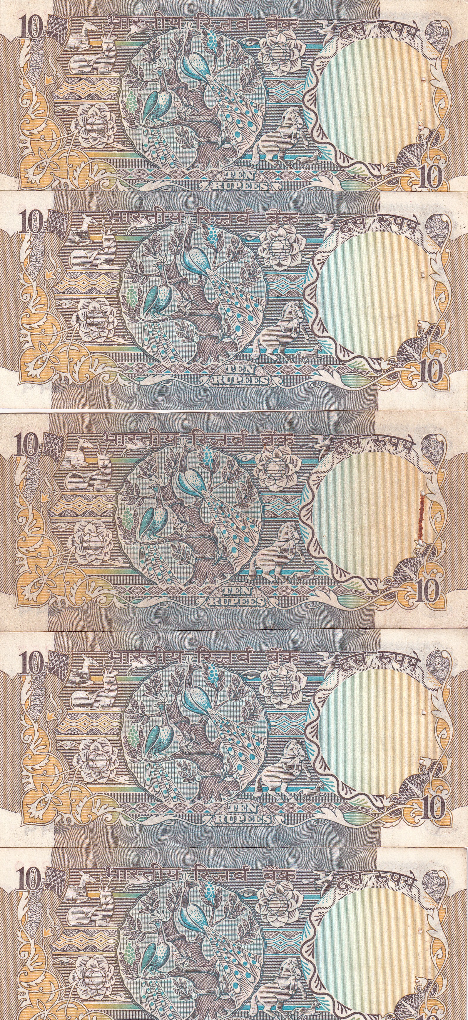 10 Rupees Peacock Governor R.N Malhotra UNC Condition (5 Pcs Lott) Note