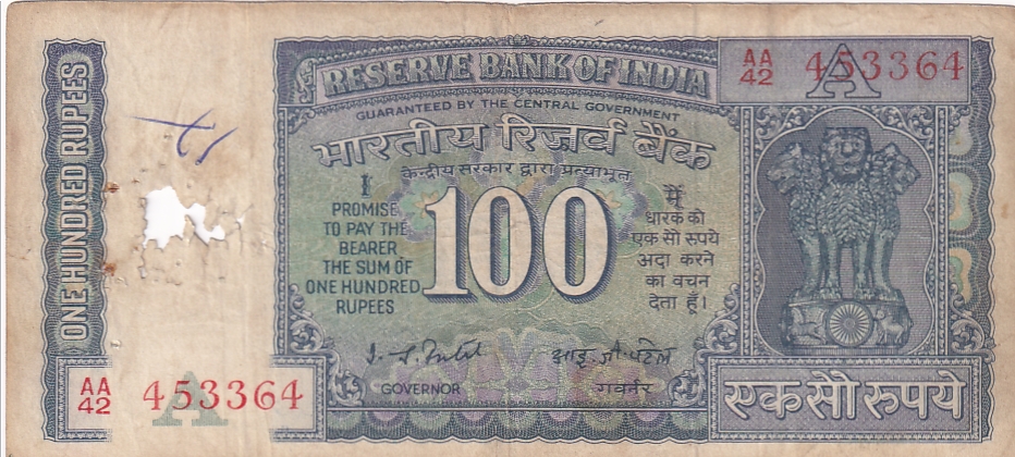 100 Rs White Strip Old Issue I G PATEL Used Fine Note #6