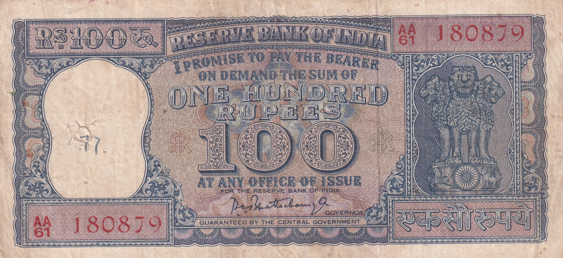 100 RUPEES DIAMOND GOVERNOR P.C BHAATTA CHARYA RARE NOTE