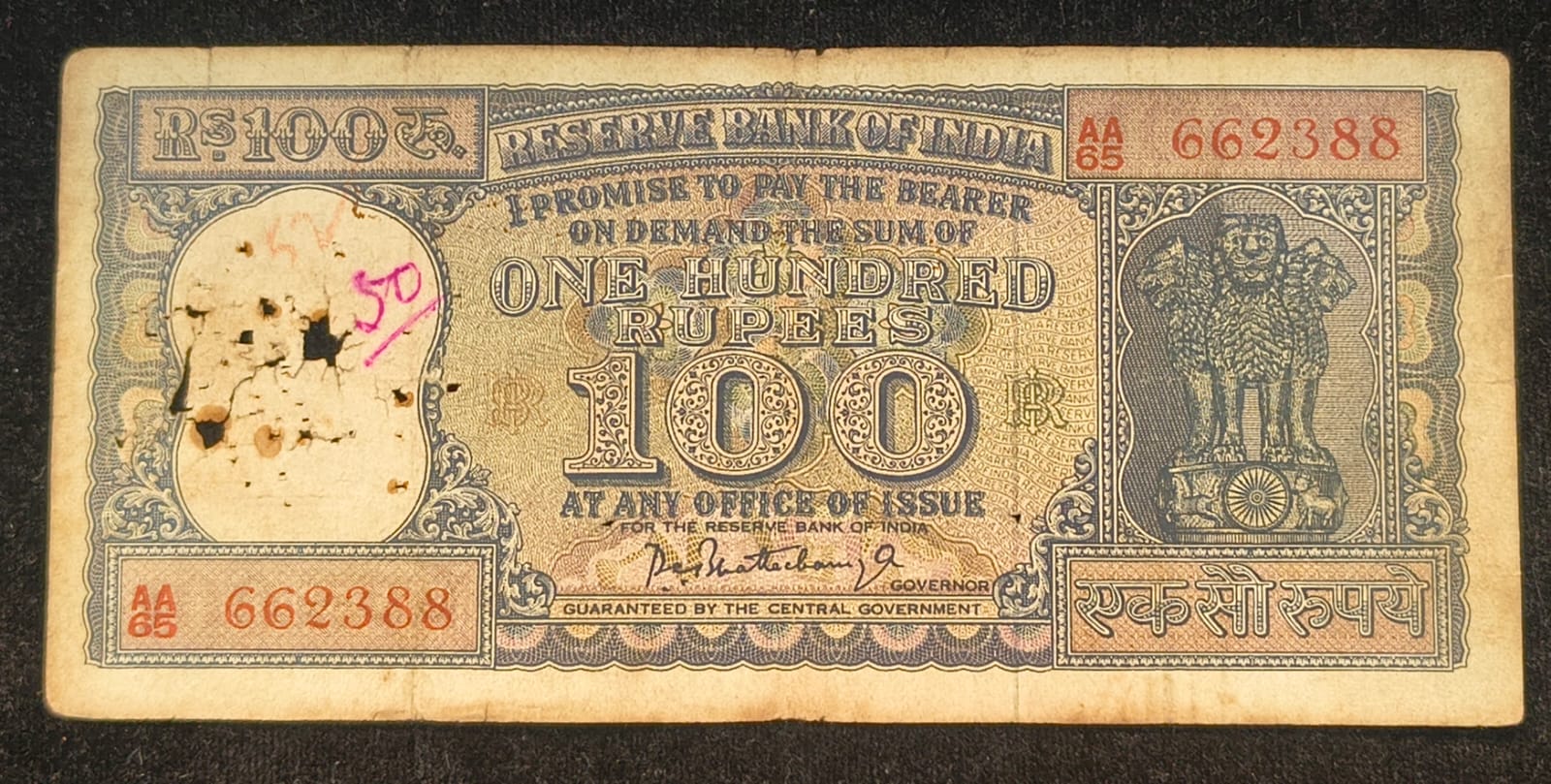 100 RUPEES DIAMOND GOVERNOR P.C.BHATTACHARYA RARE NOTE