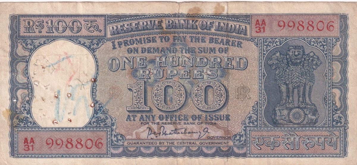 100 RUPEES DIAMOND ISSUE GOVERNOR P.C.BHATTACHARYA RARE NOTE