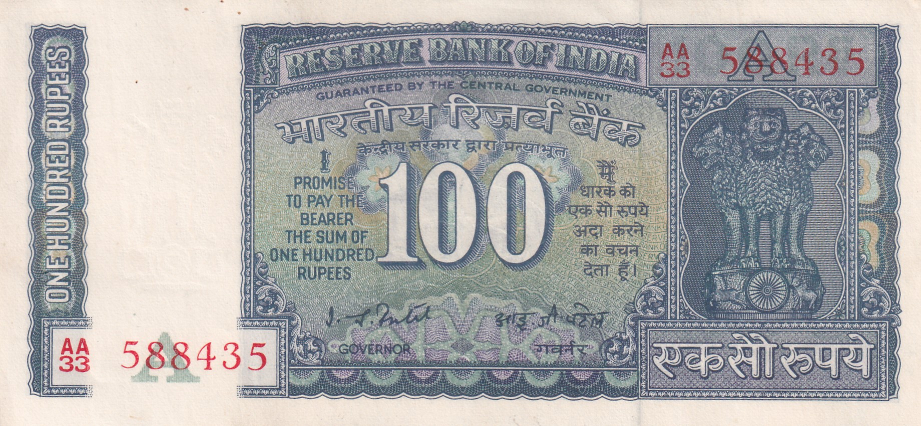 100 RUPEES GOVERNOR I.J.PATEL RARE A.U. CONDITION RARE NOTE BUYER WILL RECEIVE SAME NOTE AS PER IMAGE