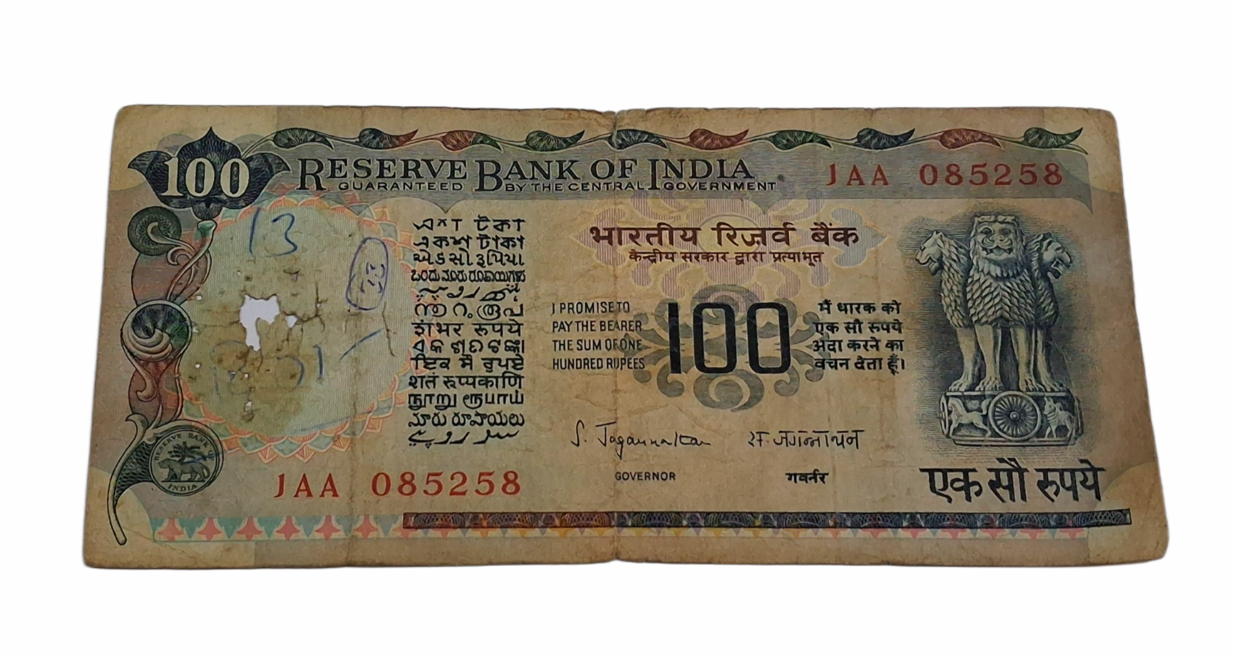 100 Rupees Old AGRICULTURE Issue Cobalt Blue Sign S.JAGANNATHAN **V. RARE** Collectable Grade.