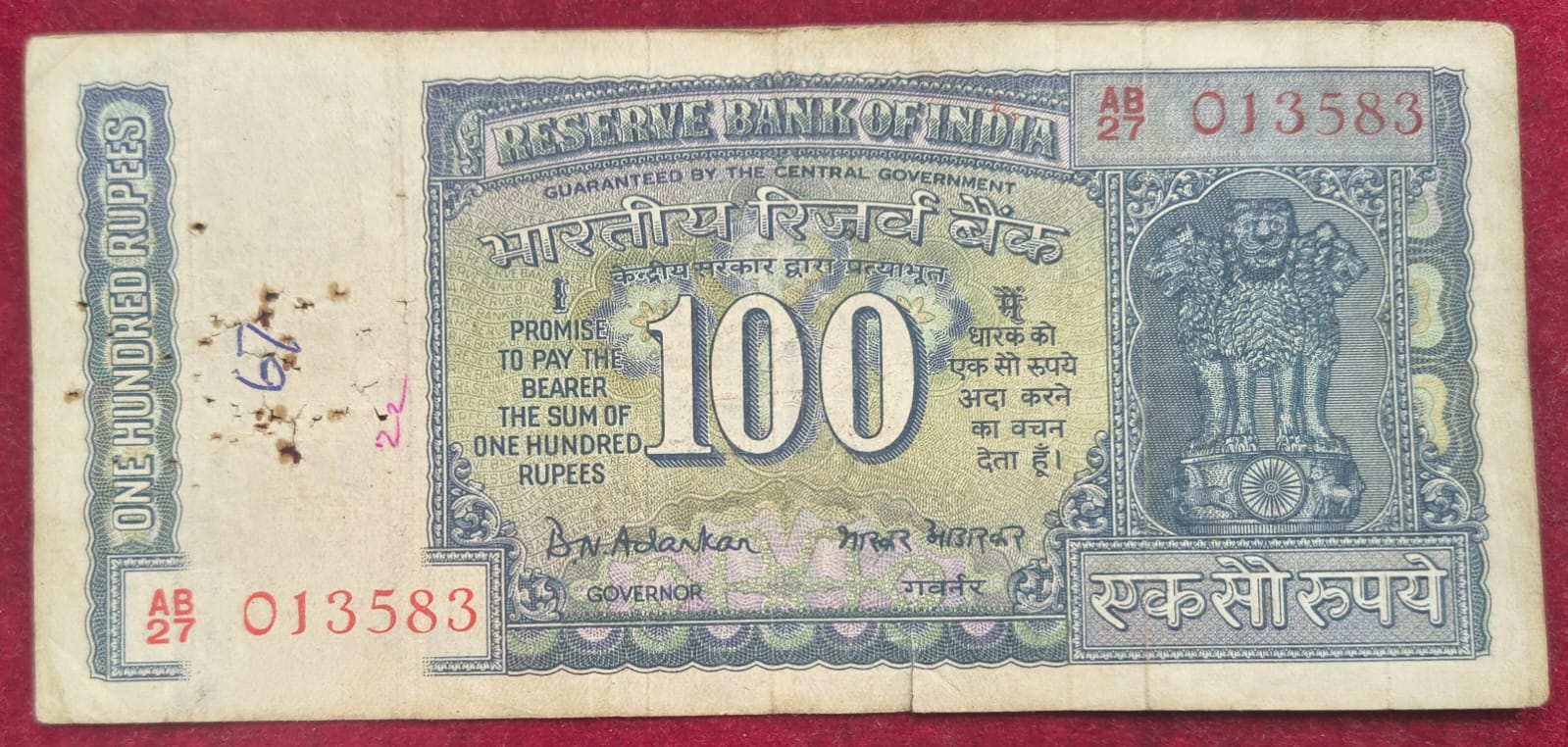 100 RUPEES WHITE PATTI GOVERNOR B.N. ADARKAR RARE NOTE