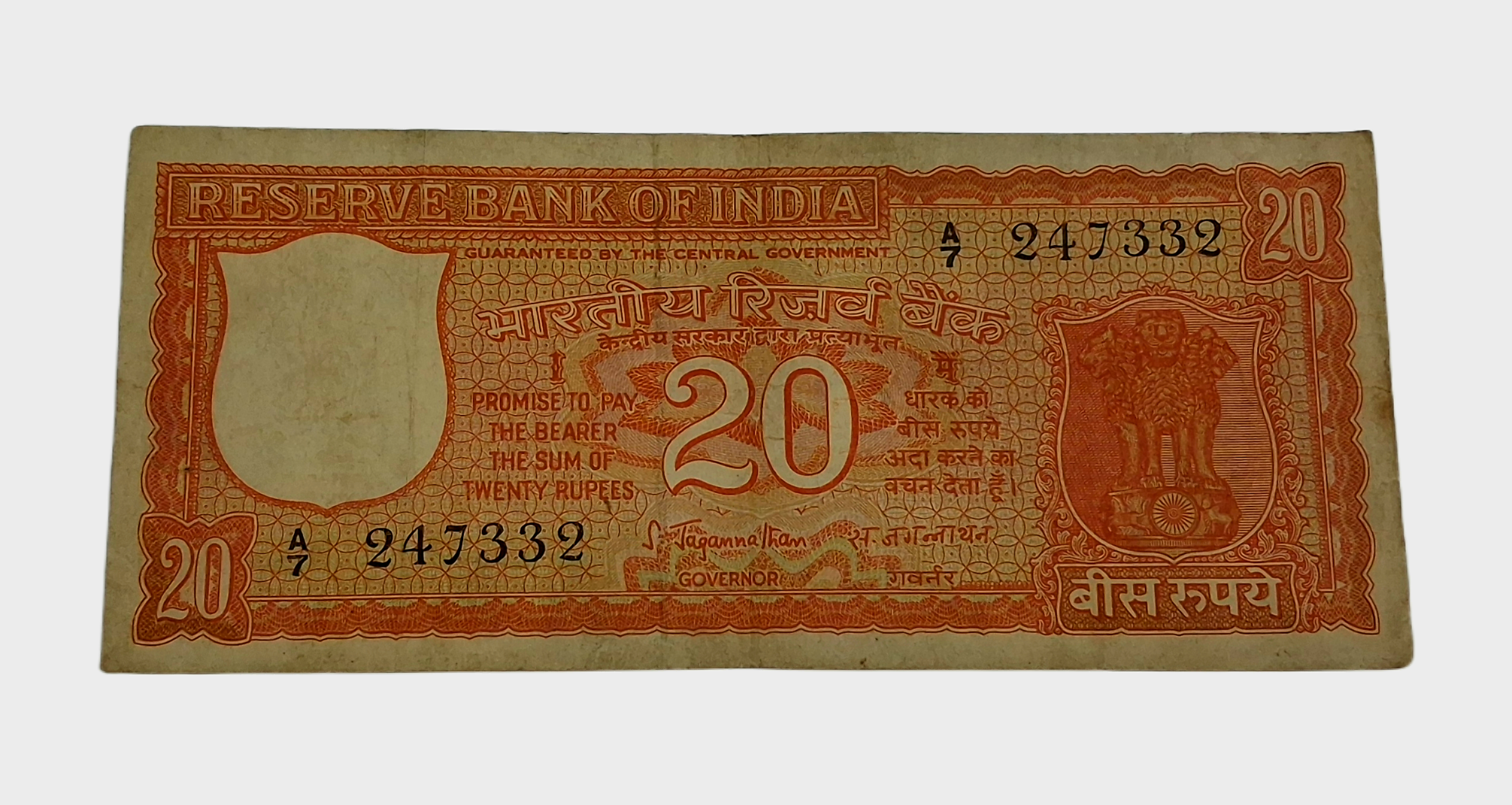 20 Rupees Old PARLIAMENT Issue Sign S. JAGANNATHAN with “A” Prefix FIRST Issue CLOSED LOTUS Catalog E1 **V.RARE** High Collectable Grade.
