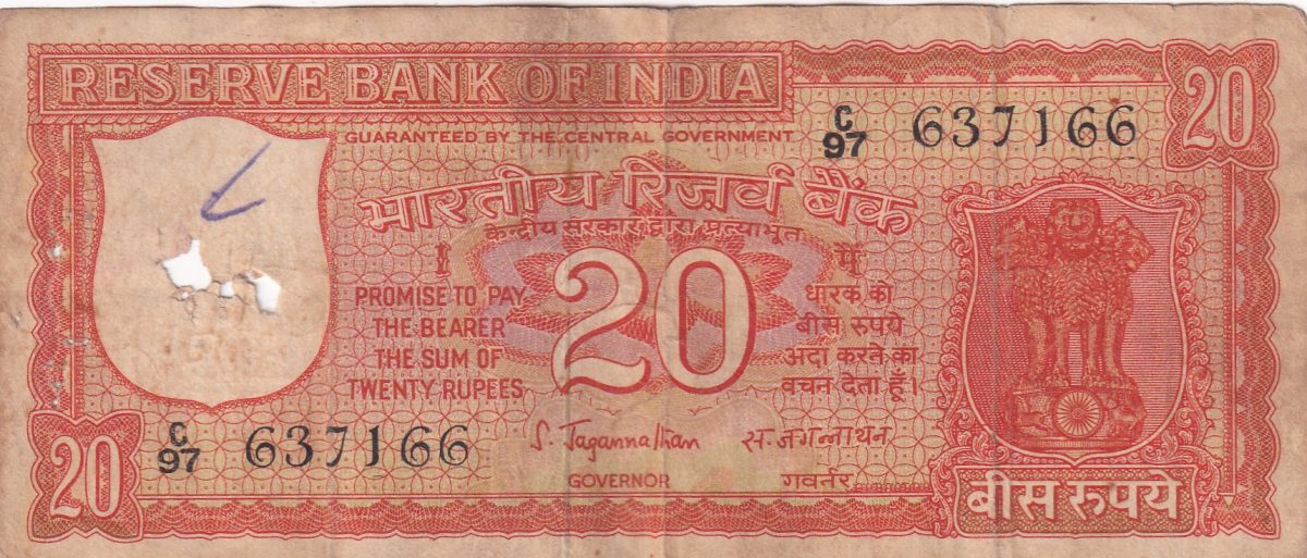 🏷️ Rare 20 Rupees note featuring Parliament Governor S. Jagannathan