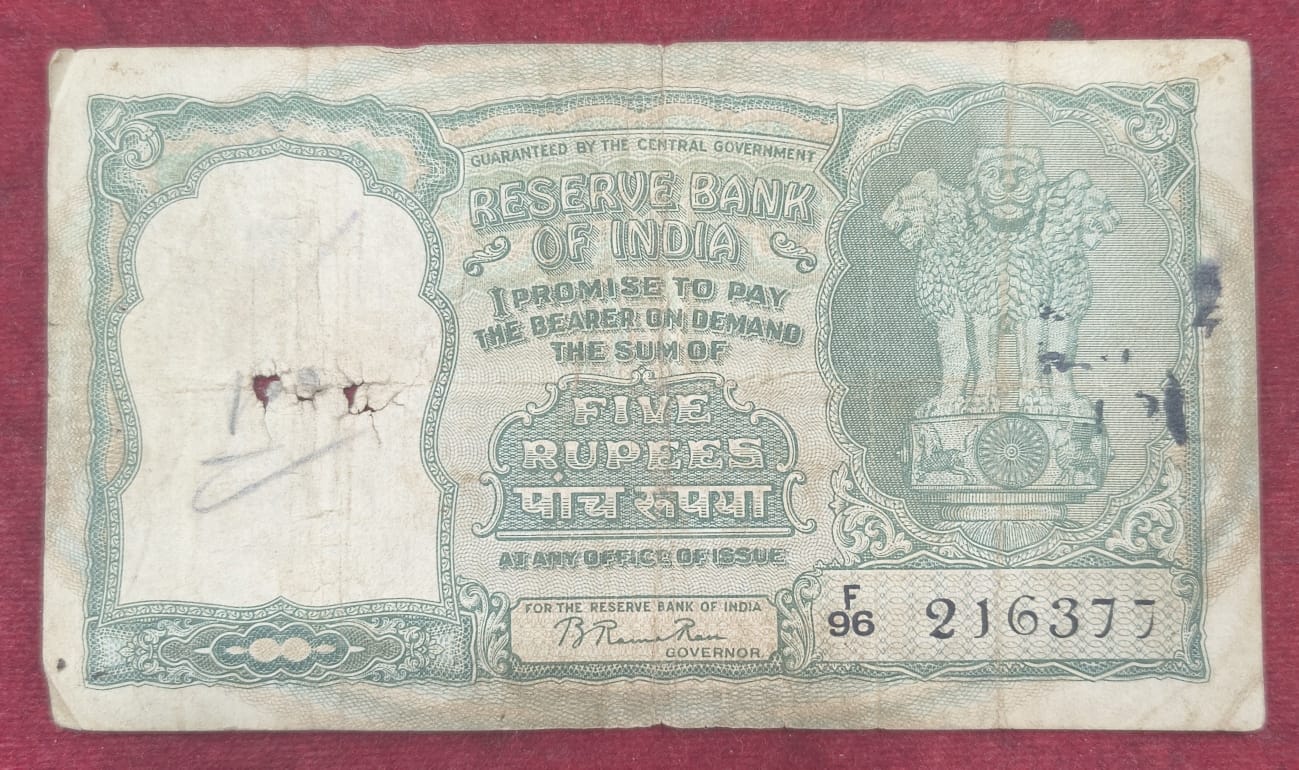 5 RUPEES FAFADA GOVERNOR B. RAMA RAO LOW CONDITION RARE NOTE