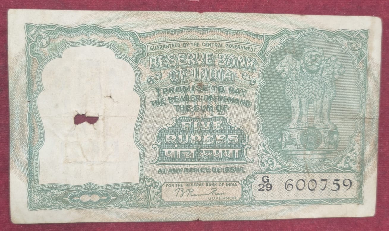 5 RUPEES FAFADA GOVERNOR B. RAMA RAO LOW CONDITION RARE NOTE