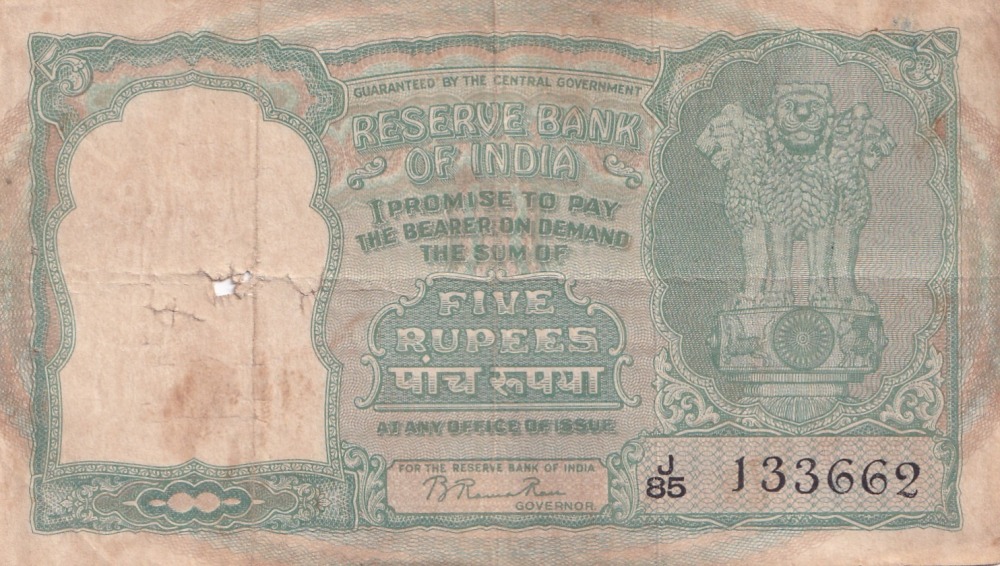 Dive into the world of numismatics with this rare and intriguing collectible – the 5 Rupees Fafda Ishu Rare Note featuring the signature of Governor B. Rama Rau. Issued by the governing authority, this banknote holds a significant historical value, reflecting the era it was circulated in. The note’s unique attributes include its denomination of 5 Rupees and the rare signature of B. Rama Rau, making it a prized possession for collectors and enthusiasts alike.