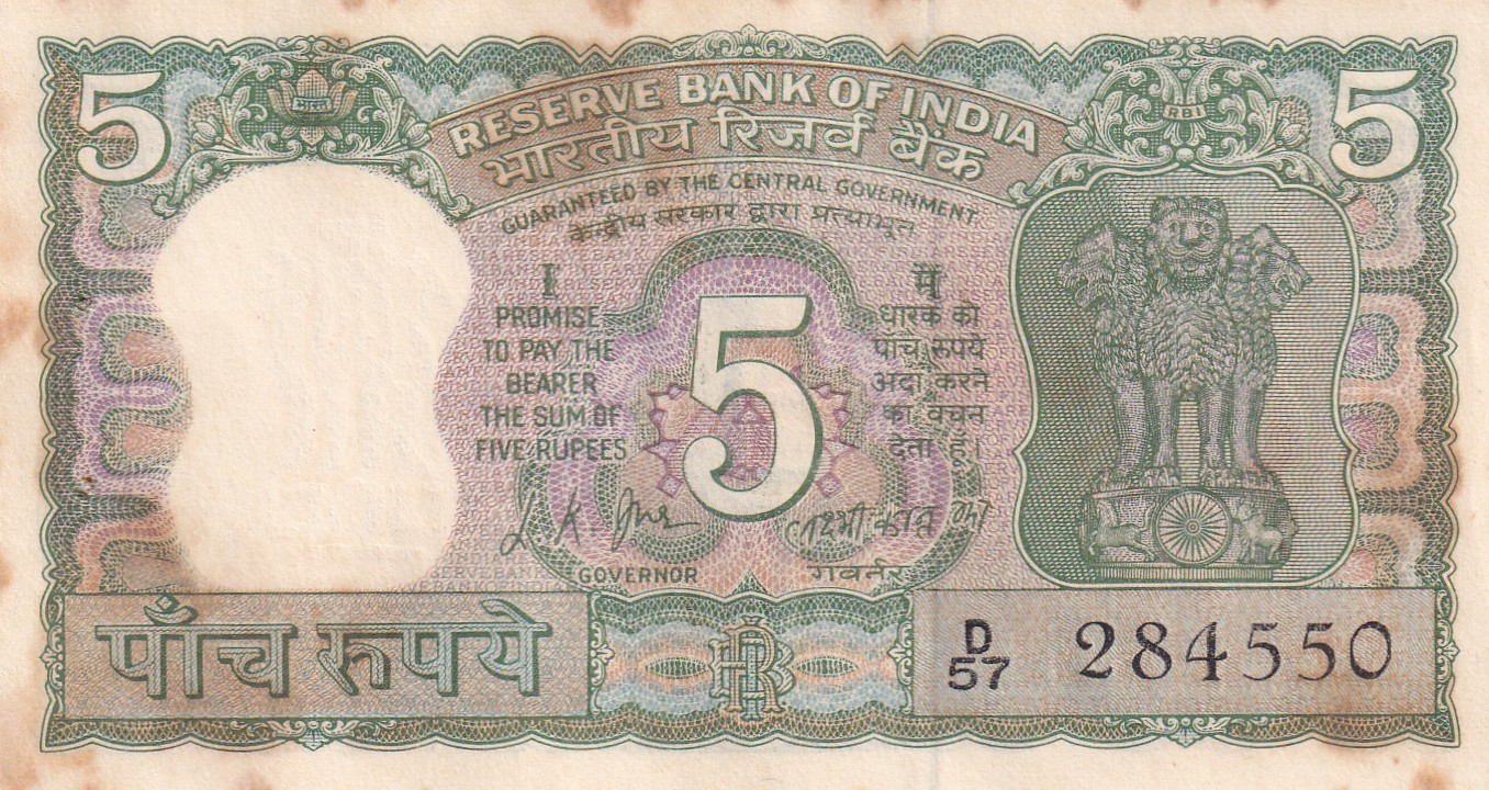 5 RUPEES GANDHI GOVERNOR LAXMI KANT UNC BUT STAIN NOTE