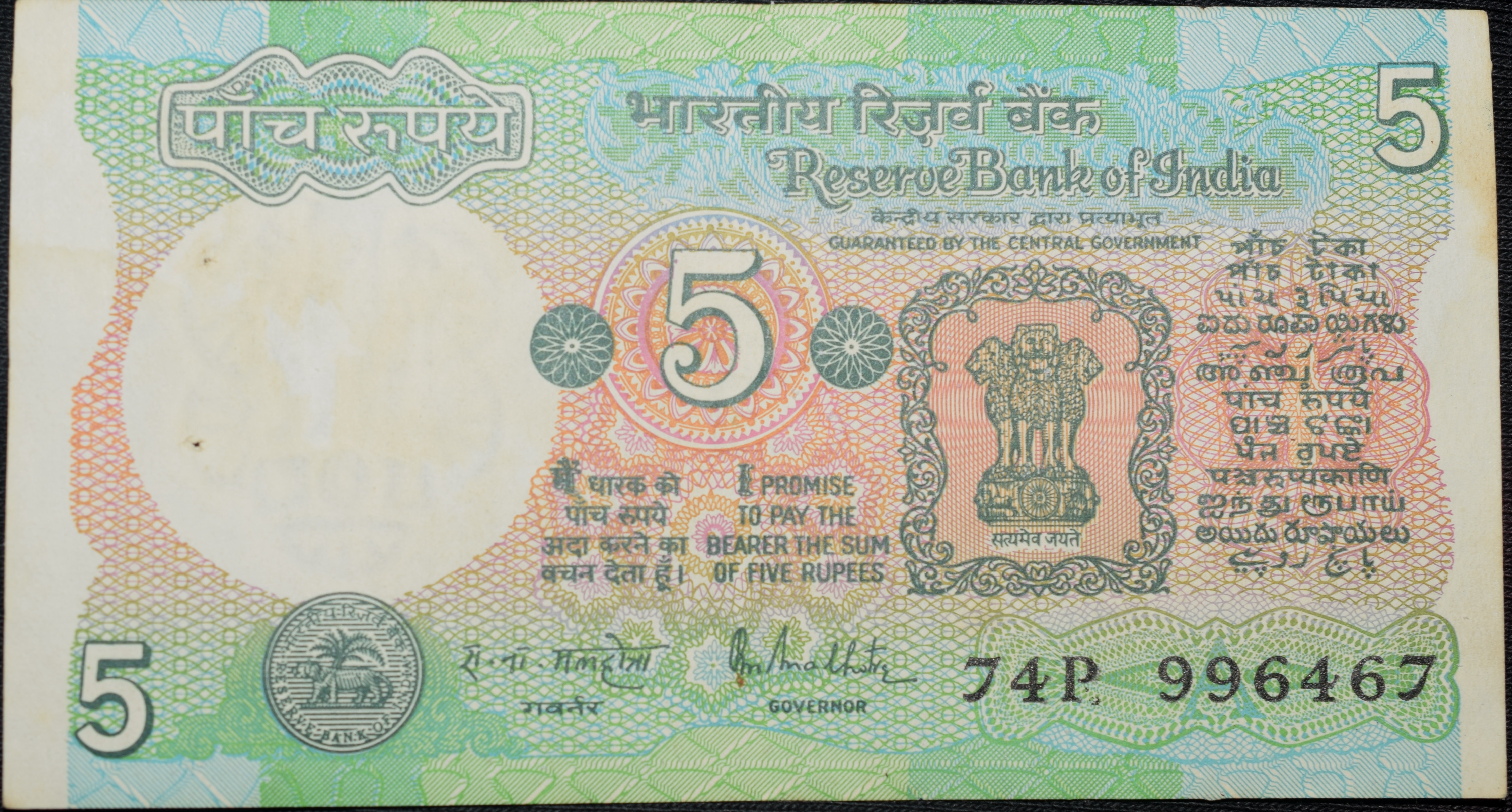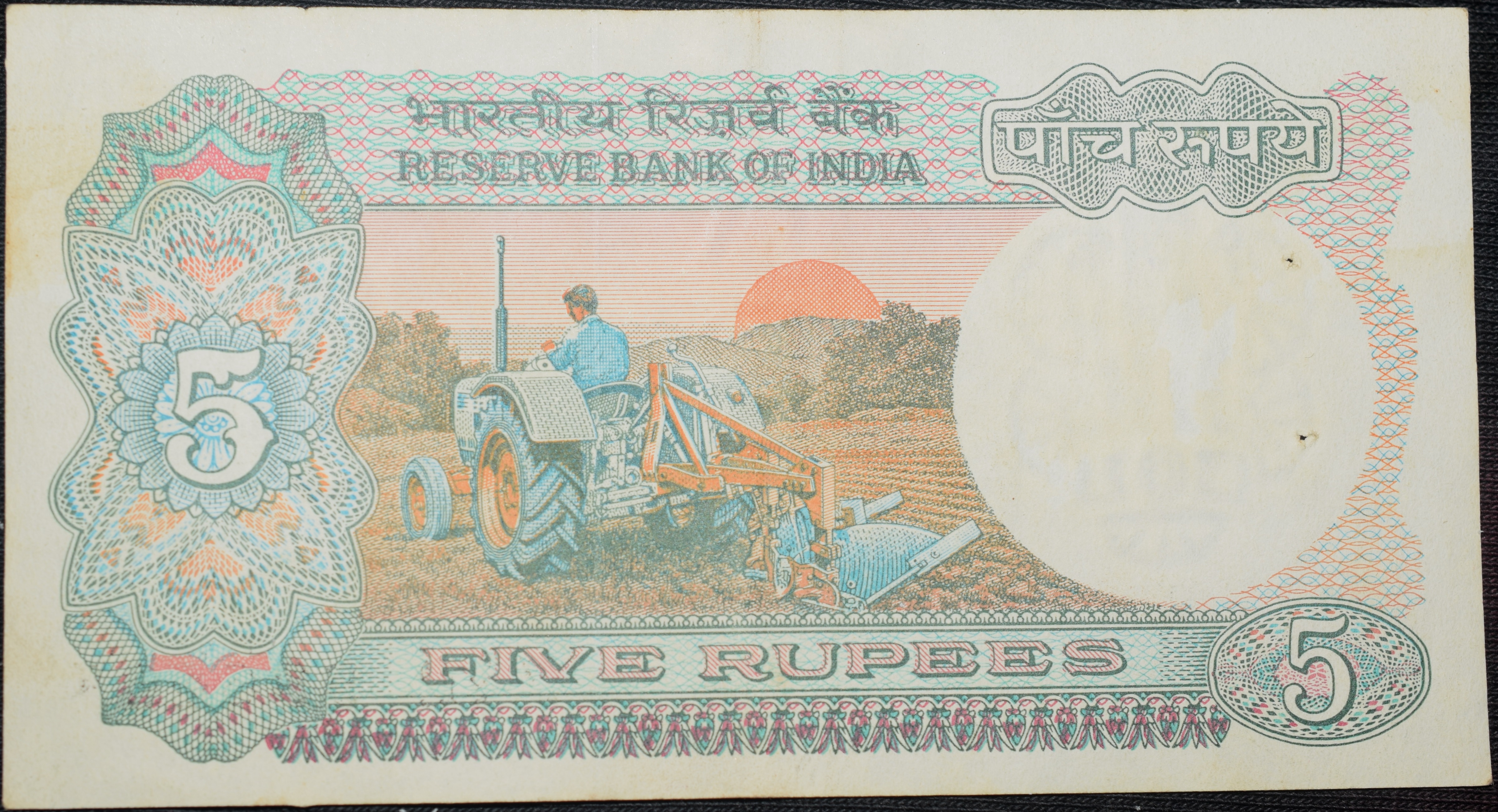 5 Rupees of Republic India (AD 1985-1990) with Farmer ploughing with a tractor while sun is rising – R.N. Malhotra Signature