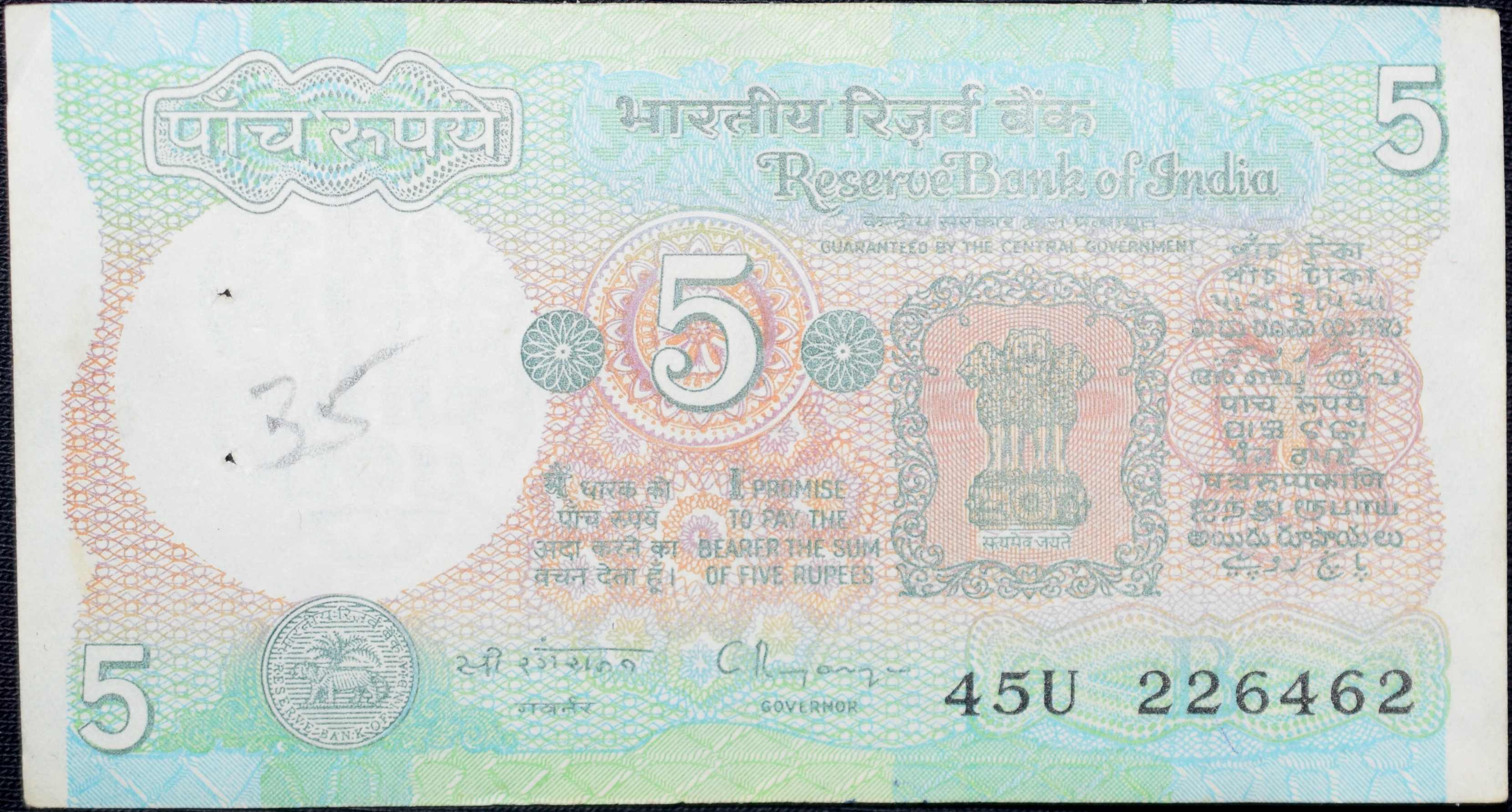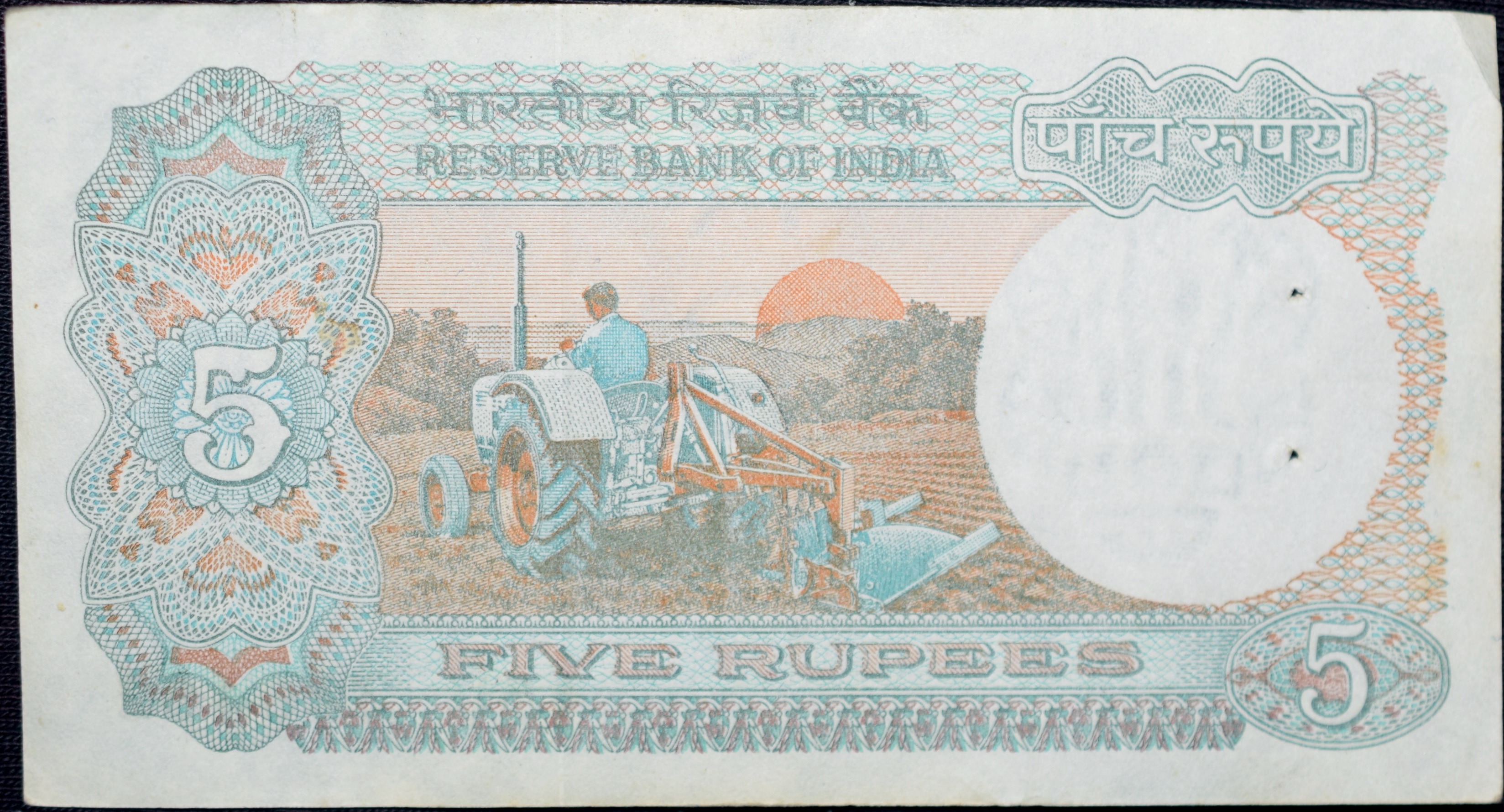 5 Rupees of Republic India (AD 1988) with Farmer ploughing with a tractor while sun is rising – S. Venkitaramanan Signature UNC