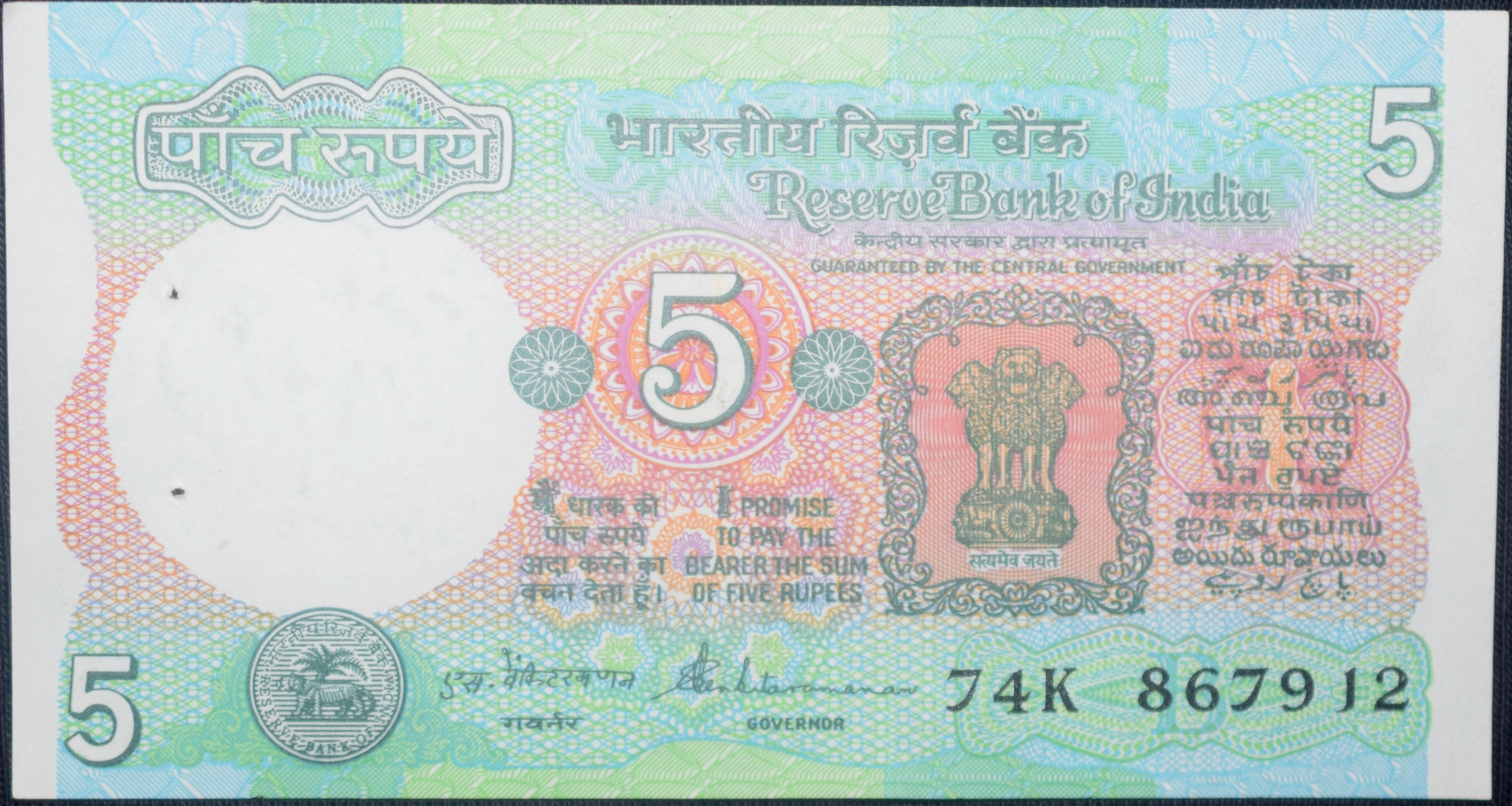 5 Rupees of Republic India (AD 1988) with Farmer ploughing with a tractor while sun is rising – S. Venkitaramanan Signature UNC