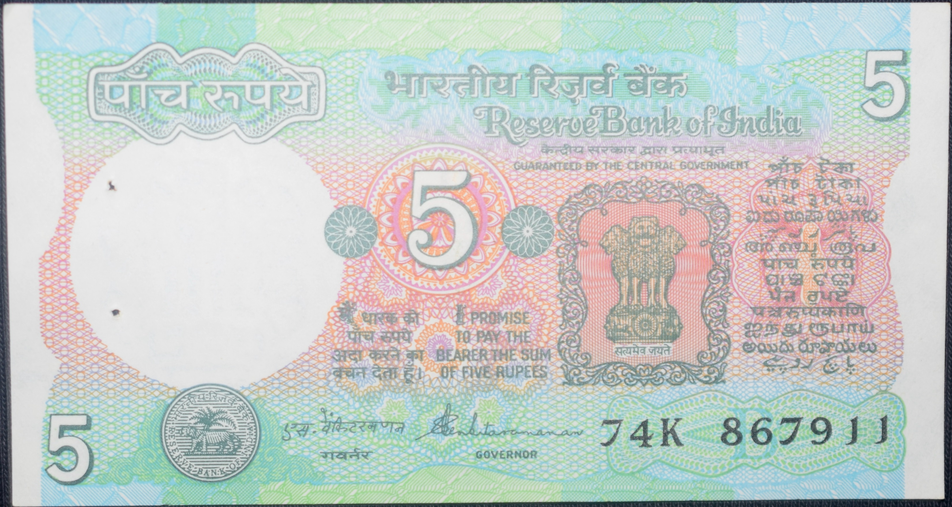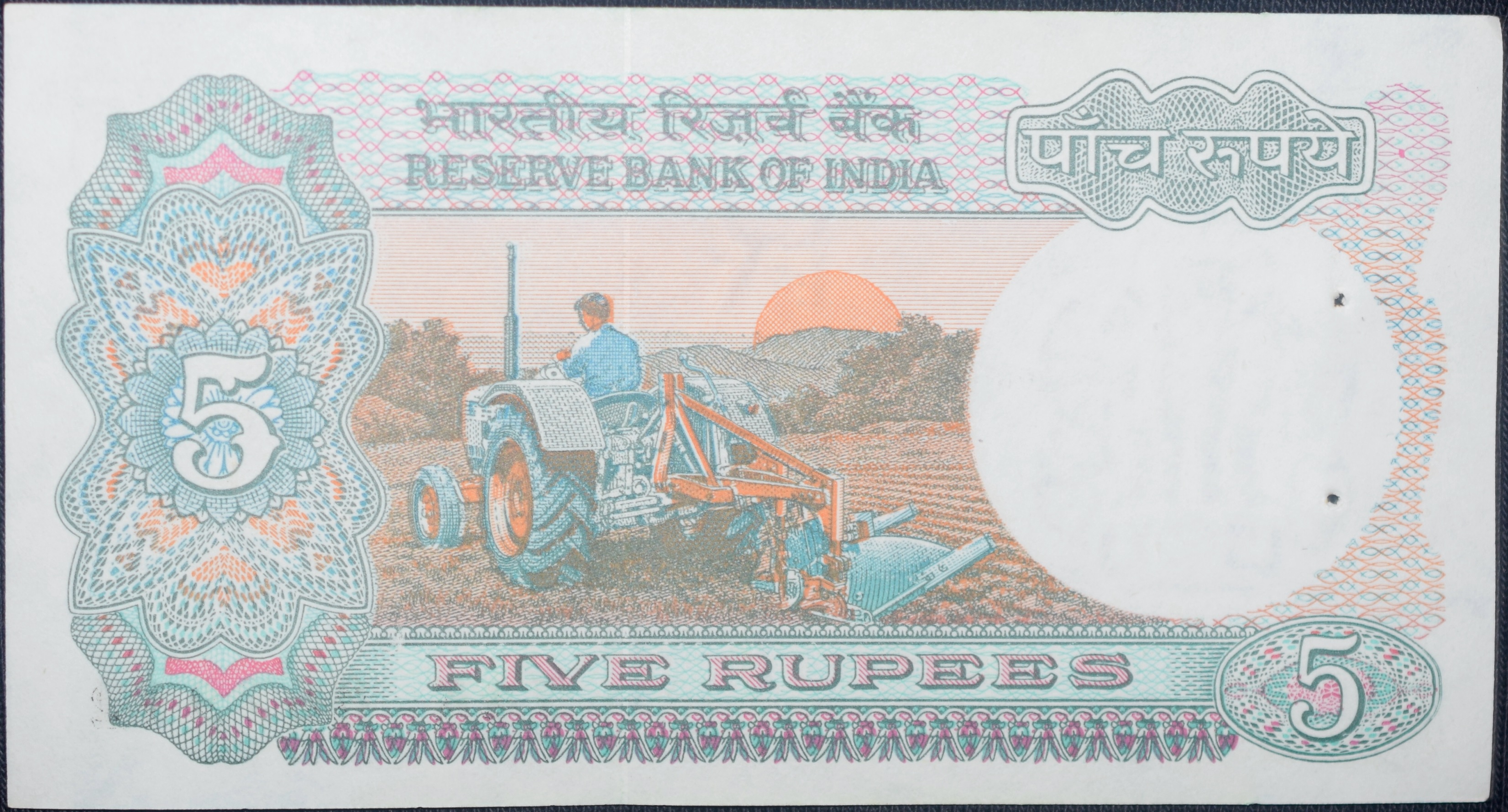 5 Rupees of Republic India (AD 1988) with Farmer ploughing with a tractor while sun is rising – S. Venkitaramanan Signature UNC
