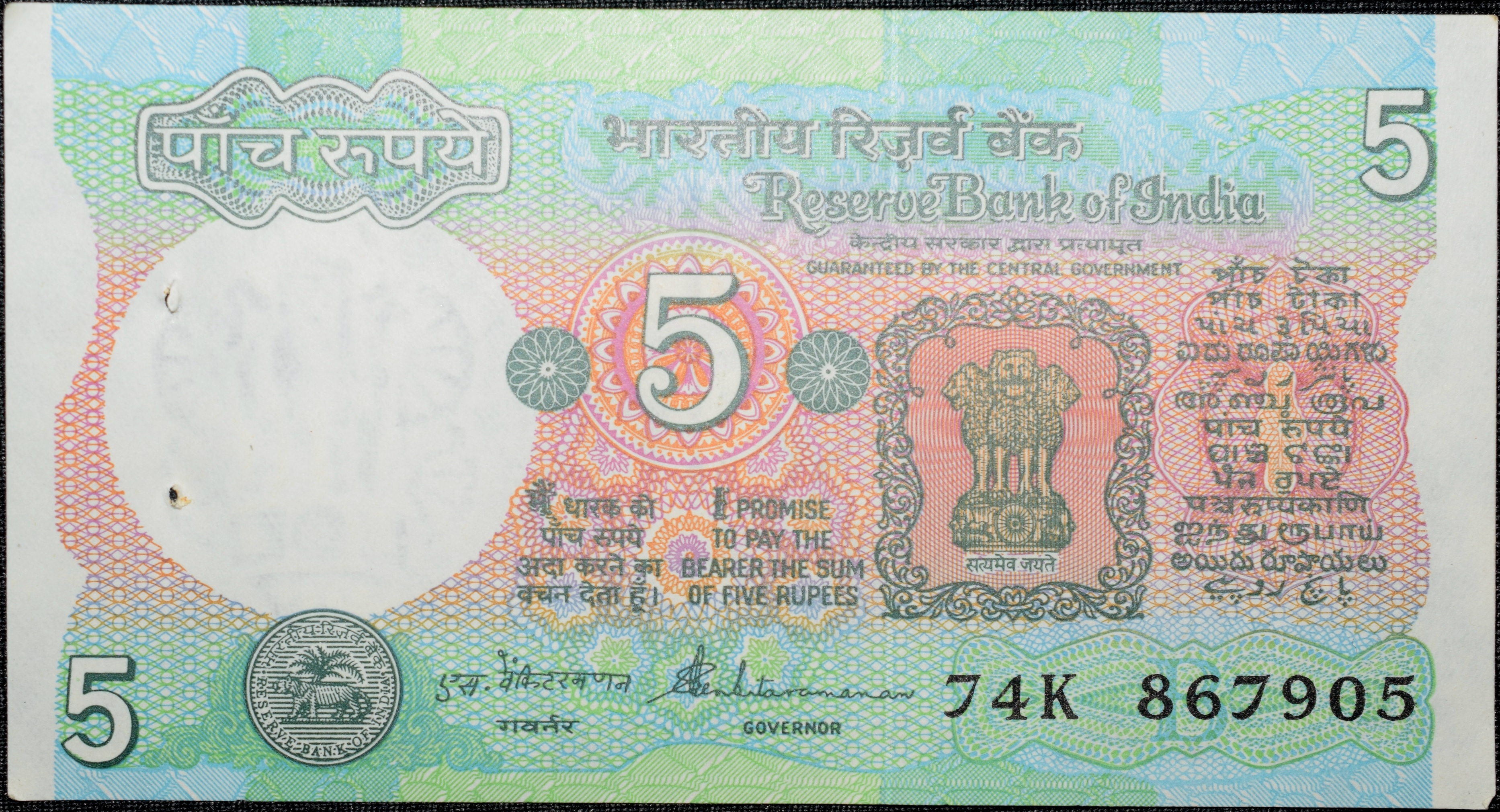 5 Rupees of Republic India (AD 1988) with Farmer ploughing with a tractor while sun is rising – S. Venkitaramanan Signature UNC