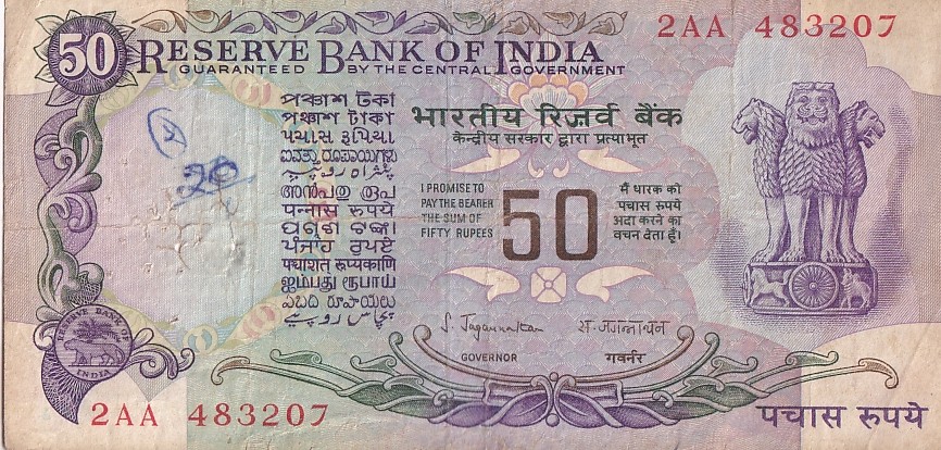 50 Rupees Without Flag Issue S Jagannathan Used Fine Note Rare #1