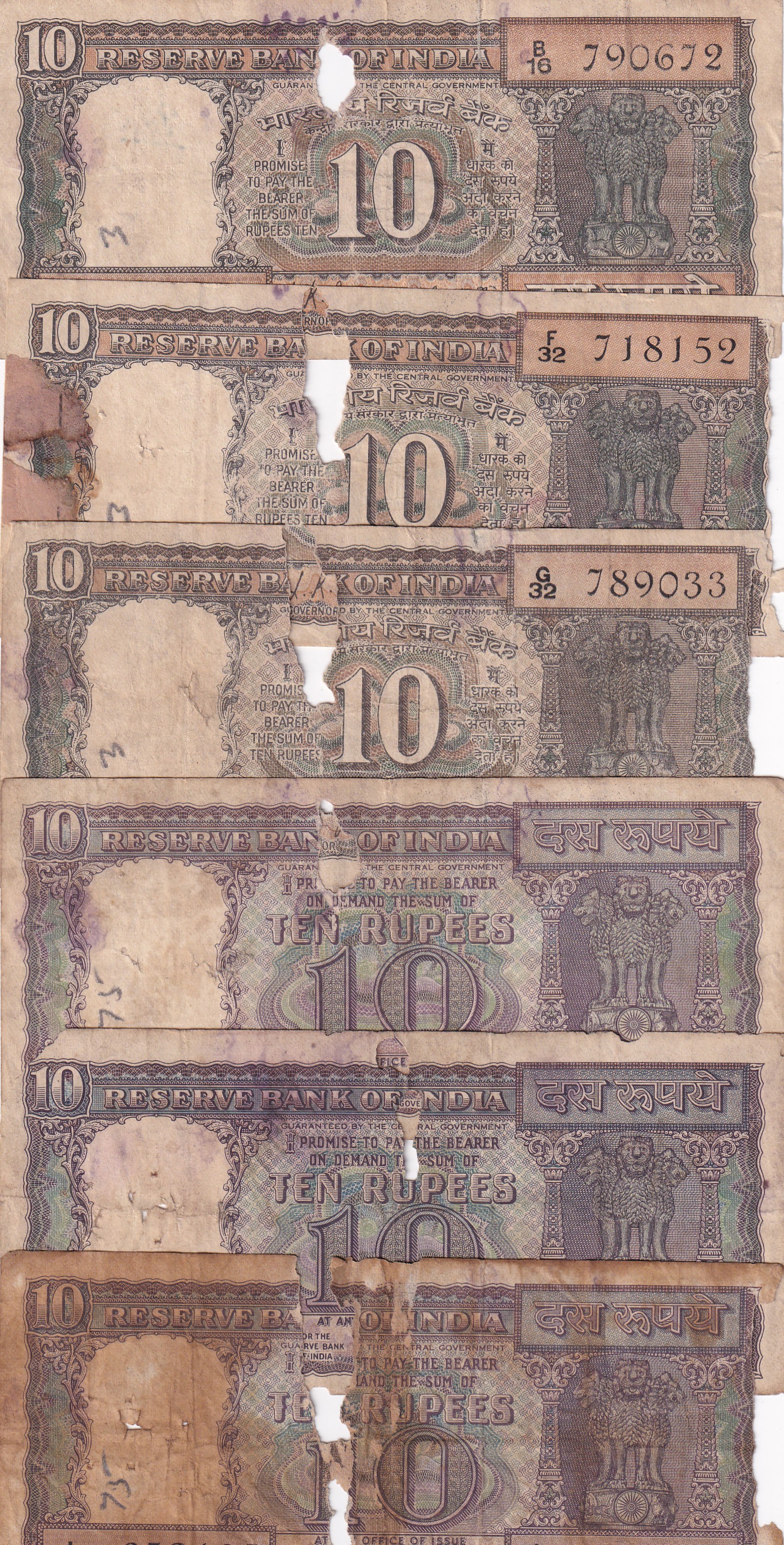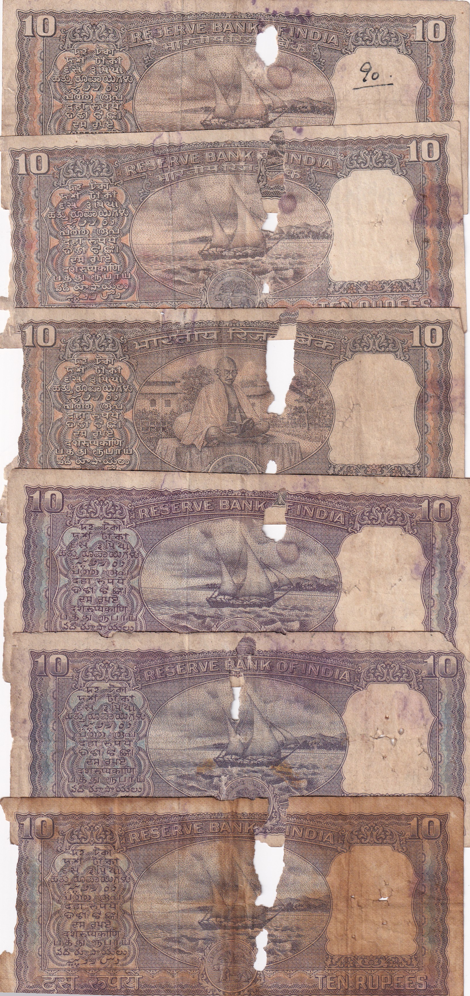 6 Pcs Lott Old Issue 10 Rupees Note Poor Condition