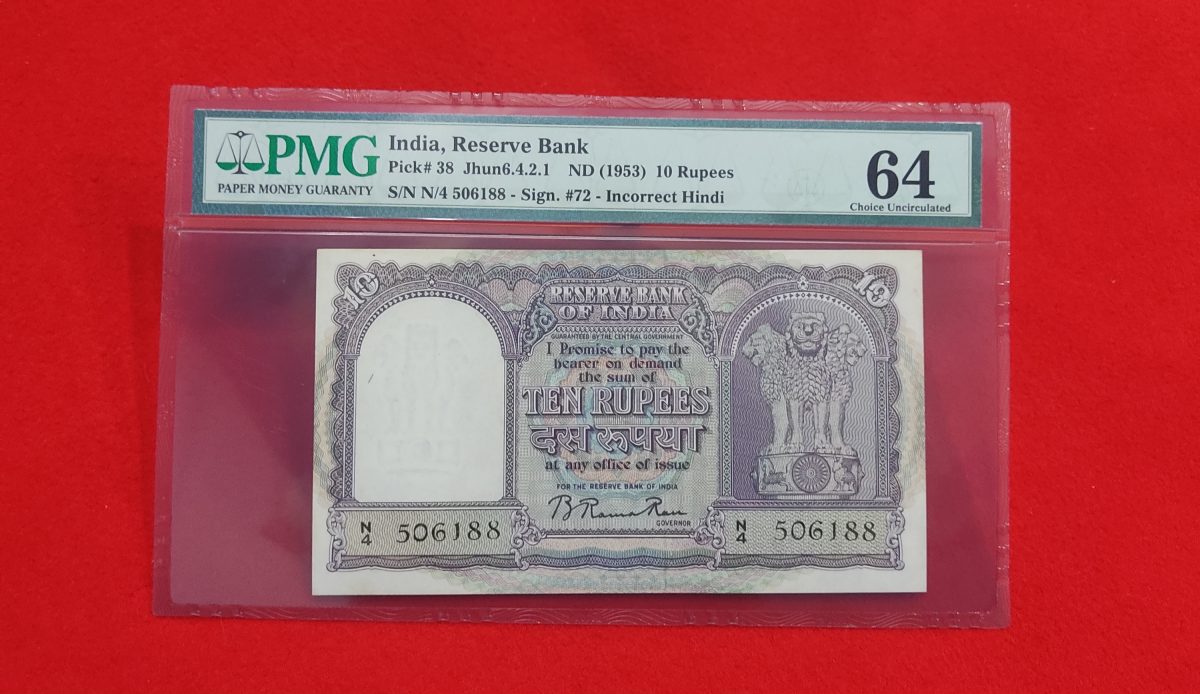 The D -3 B. RAMA RAU banknote, graded 64 by PMG, is a highly sought-after collectible featuring the signature of B Rama Rau. Issued with the serial number 506188, this rare piece holds historical significance and aesthetic appeal for numismatists and collectors alike. The note bears testament to a bygone era, possibly reflecting the economic and political landscape of its time. With its exceptional grade and unique signature, this banknote holds significant collectible value, making it a prized possession for enthusiasts looking to own a piece of history. The certification by PMG adds authenticity and credibility to this valuable item, making it a standout addition to any collection.