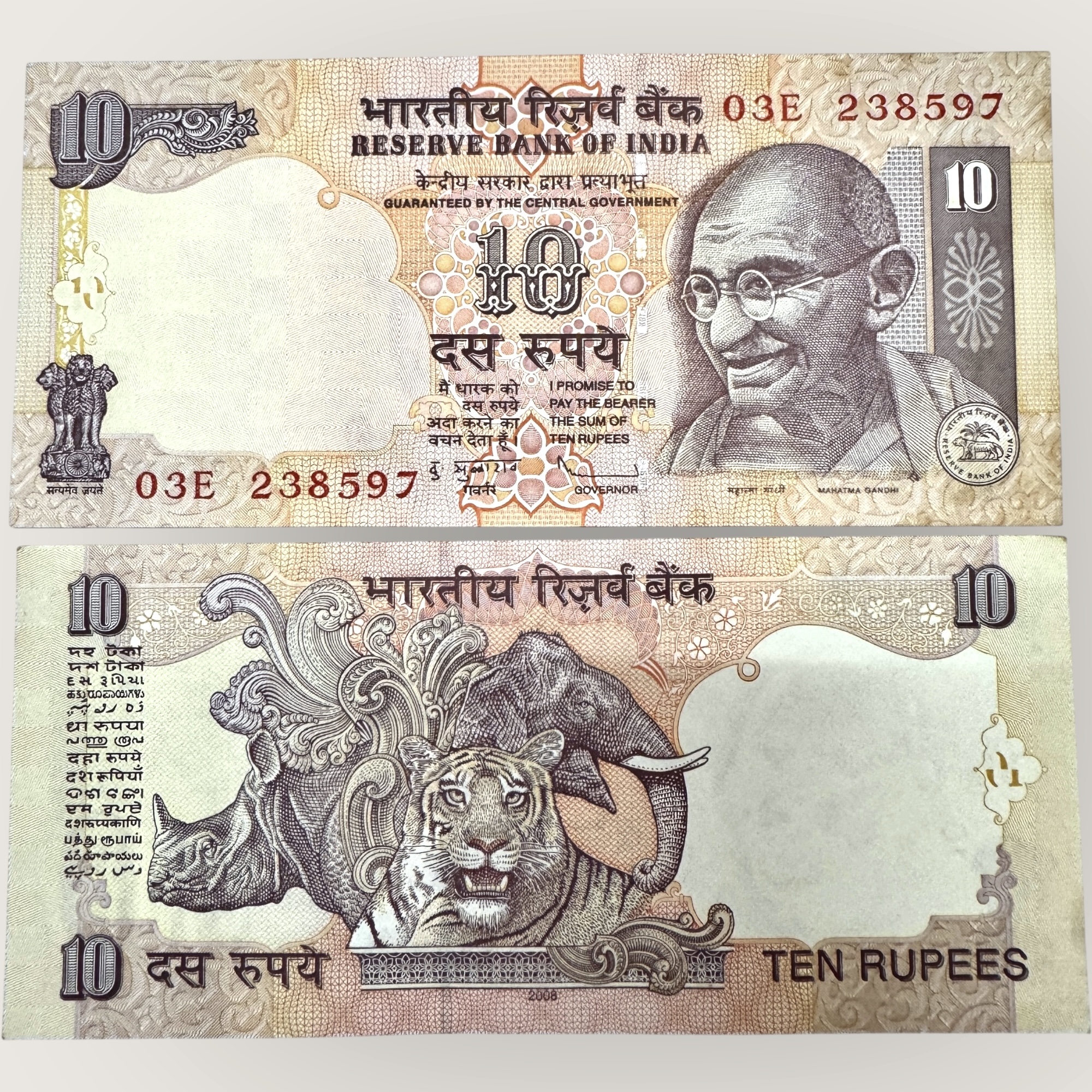 D77 – Rs 10 India Banknote Signature series Signed by D. SUBARAO Inset PLAIN 2008 Issue