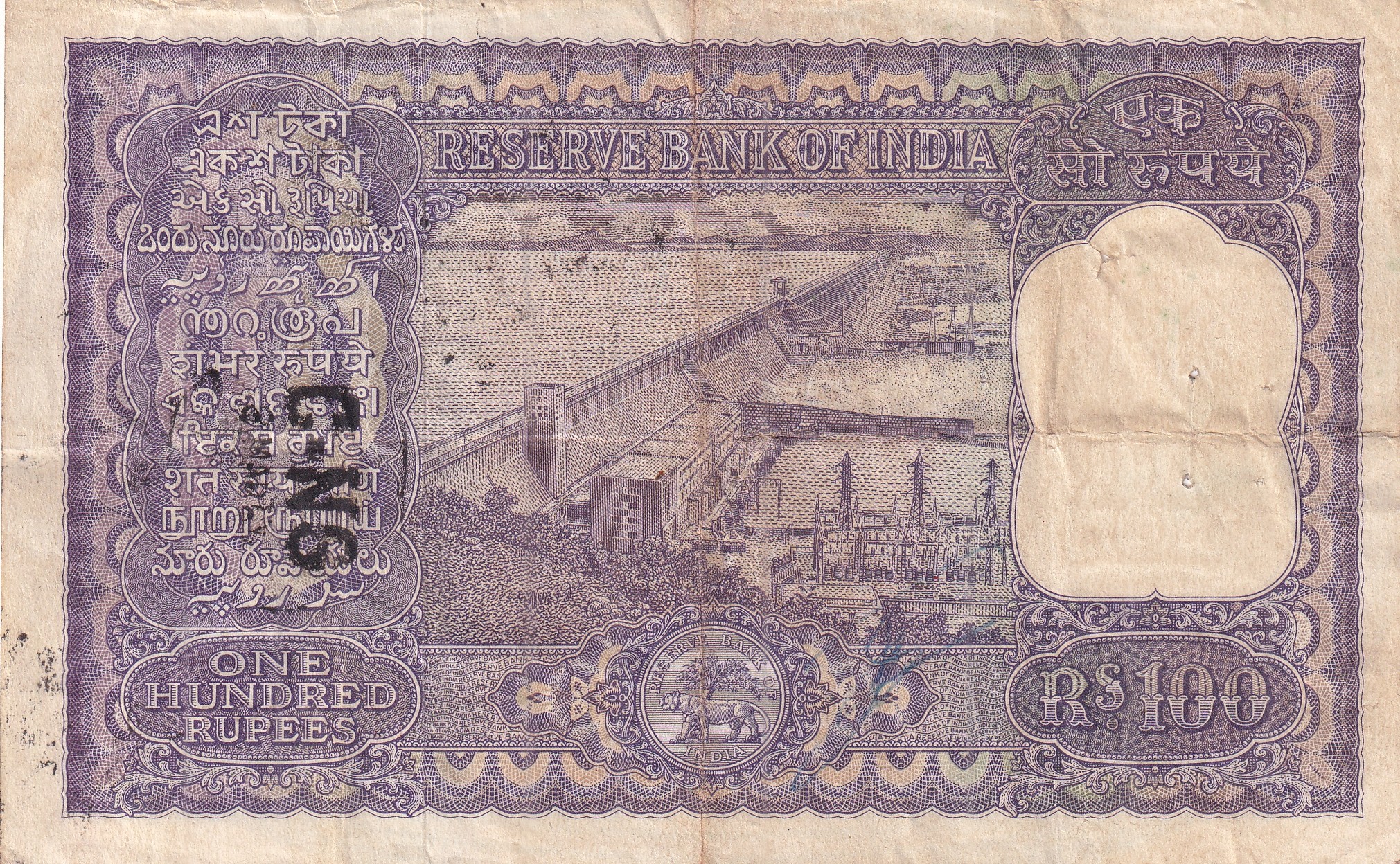 One Hundred Rupees PC Bhattachrya Big Size Hirakud Dam Back Side Rare Note #2