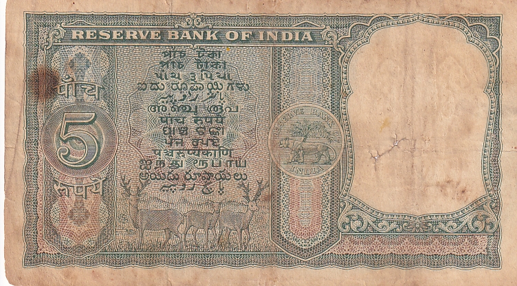 P C Bhattacharya 5 rupees Fafda Issue Three Deer Backside Old Note