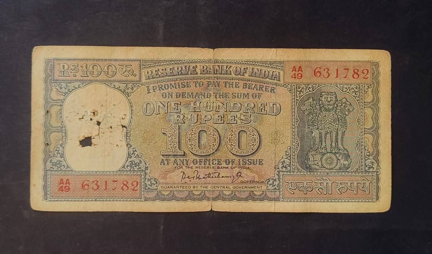 Reserve Bank of India 🏛️🏛️ 100 rs. note 💸💵💸 Signature of PC. Bhattacharya Diamond issue condition as imege Same and similar piece available